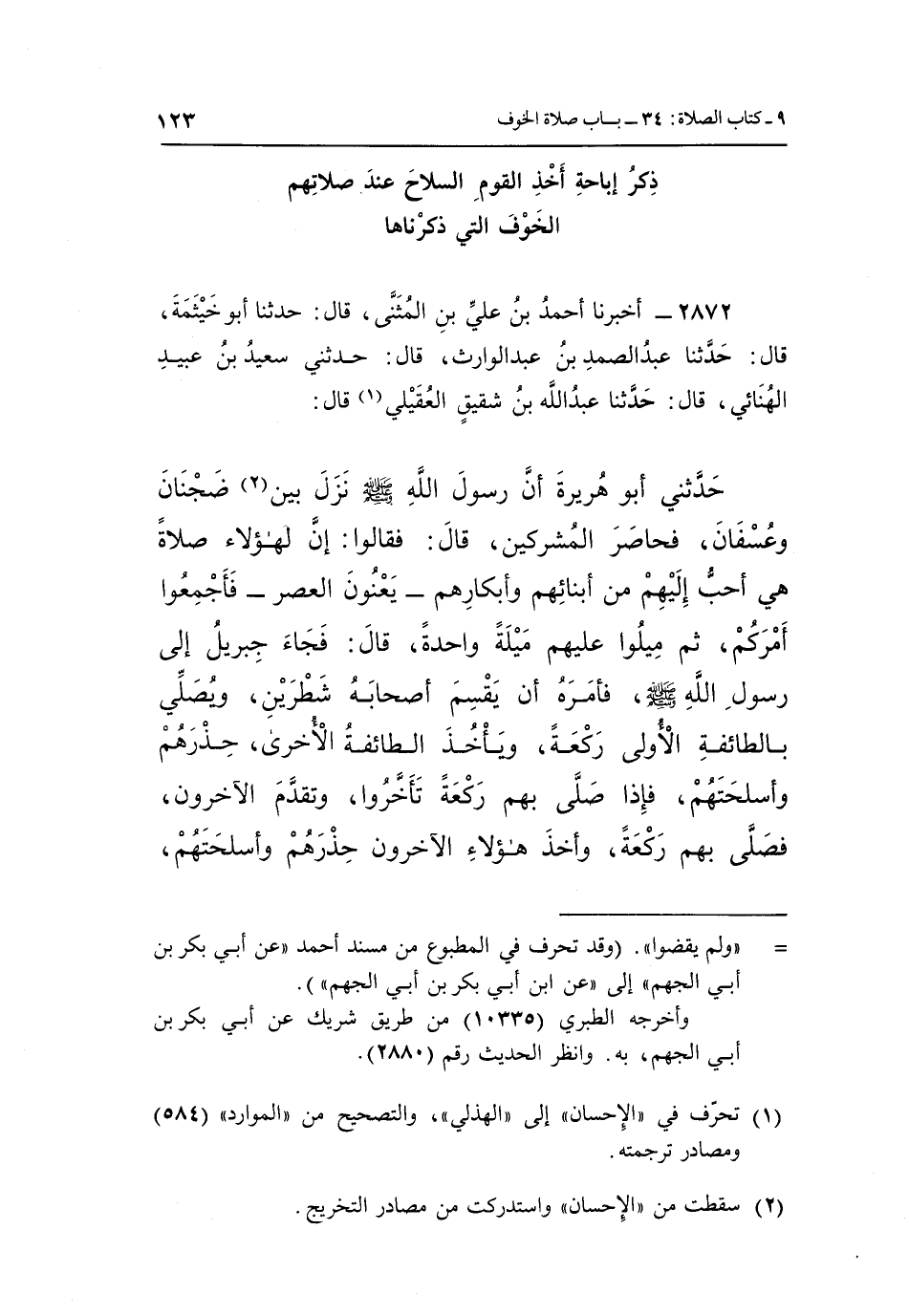 حَدَّثَنِي أَبُو هُرَيْرَةَ أَنَّ رَسُولَ اللَّهِ صَلَّى اللَّهُ عَلَيْهِ وَسَلَّمَ نَزَلَ بَيْنَ2 ضُجْنَانَ وَعُسْفَانَ فَحَاصَرَ الْمُشْرِكِينَ قَالَ: فَقَالُوا: إِنَّ لِهَؤُلَاءِ صَلَاةً هِيَ أحب إليهم من أبناءهم وَأَبْكَارِهِمْ يَعْنُونَ الْعَصْرَ فَأَجْمِعُوا أَمْرَكُمْ ثُمَّ مِيلُوا عَلَيْهِمْ مَيْلَةً وَاحِدَةً قَالَ فَجَاءَ جِبْرِيلُ إِلَى رَسُولِ اللَّهِ صَلَّى اللَّهُ عَلَيْهِ وَسَلَّمَ فَأَمَرَهُ أَنْ يَقْسِمَ أَصْحَابَهُ شَطْرَيْنِ وَيُصَلِّيَ بِالطَّائِفَةِ الْأُولَى رَكْعَةً وَيَأْخُذُ الطَّائِفَةُ الْأُخْرَى حِذْرَهُمْ وَأَسْلِحَتَهُمْ فَإِذَا صَلَّى بِهِمْ رَكْعَةً تَأَخَّرُوا وَتَقَدَّمَ الْآخَرُونَ فَصَلَّى بِهِمْ رَكْعَةً وَأَخَذَ هَؤُلَاءِ الْآخَرُونَ حِذْرَهُمْ وَأَسْلِحَتَهُمْ