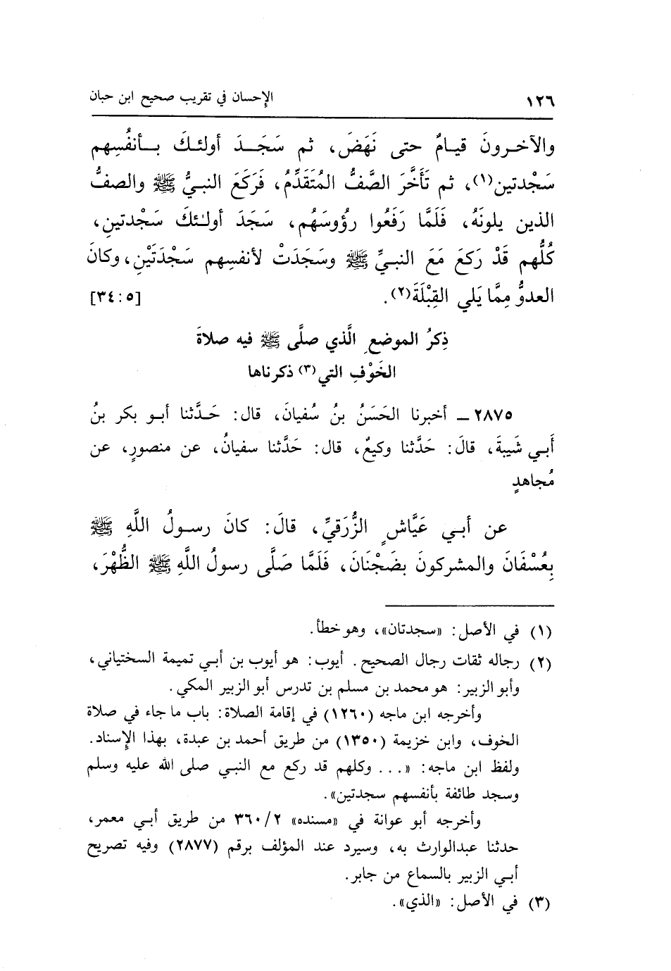 وَالْآخَرُونَ قِيَامٌ حَتَّى نَهَضَ ثُمَّ سَجَدَ أُولَئِكَ بِأَنْفُسِهِمْ سَجْدَتَيْنِ1 ثُمَّ تَأَخَّرَ الصَّفُّ الْمُتَقَدِّمُ فَرَكَعَ النَّبِيُّ صَلَّى اللَّهُ عَلَيْهِ وَسَلَّمَ وَالصَّفُّ الَّذِينَ يلونه فلما رفعوا رؤوسهم سَجَدَ أُولَئِكَ سَجْدَتَيْنِ كُلُّهُمْ قَدْ رَكَعَ مَعَ النَّبِيِّ صَلَّى اللَّهُ عَلَيْهِ وَسَلَّمَ وَسَجَدَتْ لِأَنْفُسِهِمْ سجدتين وكان العدو مما يلي القبلة2. [34:5]