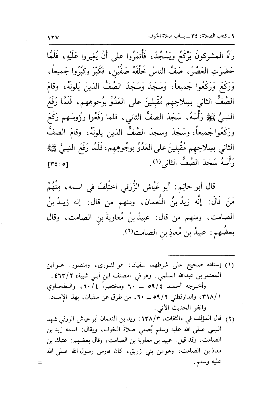 رَآهُ الْمُشْرِكُونَ يَرْكَعُ وَيَسْجُدُ فَأْتَمَرُوا عَلَى أَنْ يُغِيرُوا عَلَيْهِ فَلَمَّا حَضَرَتِ الْعَصْرُ صَفَّ النَّاسُ خَلْفَهُ صَفَّيْنِ فَكَبَّرَ وَكَبَّرُوا جَمِيعًا وَرَكَعَ وَرَكَعُوا جَمِيعًا وَسَجَدَ وَسَجَدَ الصَّفُّ الَّذِينَ يَلُونَهُ وَقَامَ الصَّفُّ الثَّانِي بِسِلَاحِهِمْ مُقْبِلِينَ عَلَى الْعَدُوِّ بِوُجُوهِهِمْ فَلَمَّا رَفَعَ النَّبِيُّ صَلَّى اللَّهُ عَلَيْهِ وَسَلَّمَ رأسه سجد الصف الثاني فلما رفعوا رؤوسهم رَكَعَ وَرَكَعُوا جَمِيعًا وَسَجَدَ وَسَجَدَ الصَّفُّ الَّذِينَ يَلُونَهُ وَقَامَ الصَّفُّ الثَّانِي بِسِلَاحِهِمْ مُقْبِلِينَ عَلَى الْعَدُوِّ بِوُجُوهِهِمْ فَلَمَّا رَفَعَ النَّبِيُّ صَلَّى اللَّهُ عَلَيْهِ وَسَلَّمَ رَأْسَهُ سَجَدَ الصَّفُّ الثَّانِي1. [34:5]