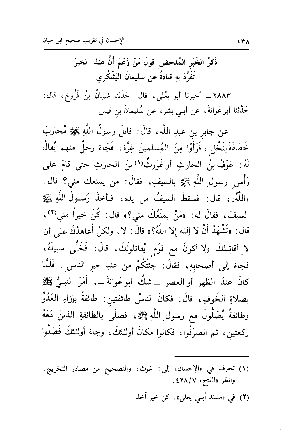عَنْ جَابِرِ بْنِ عَبْدِ اللَّهِ قَالَ: قَاتَلَ رَسُولُ اللَّهِ صَلَّى اللَّهُ عَلَيْهِ وَسَلَّمَ مُحَارِبَ خَصَفَةَ بنخل فرأوا من المسلمين غرة فجاءه رَجُلٌ مِنْهُمْ يُقَالُ لَهُ عَوْفُ بْنُ الْحَارِثِ أَوْ غَوْرَثُ1 بْنُ الْحَارِثِ حَتَّى قَامَ عَلَى رَأْسَ رَسُولِ اللَّهِ صَلَّى اللَّهُ عَلَيْهِ وَسَلَّمَ بِالسَّيْفِ فَقَالَ مَنْ يَمْنَعُكَ مِنِّي؟ قَالَ: "اللَّهُ" قَالَ: فَسَقَطَ السَّيْفُ مِنْ يَدِهِ فَأَخَذَ رَسُولُ اللَّهِ صَلَّى اللَّهُ عَلَيْهِ وَسَلَّمَ السَّيْفَ فَقَالَ لَهُ: "مَنْ يَمْنَعُكَ مِنِّي؟ " قَالَ: كُنَّ خَيْرًا مِنِّي2 قَالَ: "تَشَهَّدُ أَنْ لَا إِلَهَ إِلَّا اللَّهُ؟ " قَالَ: لَا وَلَكِنْ أُعَاهِدُكَ عَلَى أَنْ لَا أُقَاتِلَكَ وَلَا أَكُونَ مَعَ قَوْمٍ يُقَاتِلُونَكَ قَالَ: فَخَلَّى سَبِيلَهُ فَجَاءَ إِلَى أَصْحَابِهِ فَقَالَ: جِئْتُكُمْ مِنْ عِنْدِ خَيْرِ النَّاسِ فَلَمَّا كَانَ عند الظهر أو العصر شكك أو عَوَانَةَ أَمَرَ النَّبِيُّ صَلَّى اللَّهُ عَلَيْهِ وَسَلَّمَ بِصَلَاةِ الْخَوْفِ قَالَ: فَكَانَ النَّاسُ طَائِفَتَيْنِ طَائِفَةً بِإِزَاءِ الْعَدُوِّ وَطَائِفَةً يُصَلُّونَ مَعَ رَسُولِ اللَّهِ صَلَّى اللَّهُ عَلَيْهِ وَسَلَّمَ فَصَلَّى بِالطَّائِفَةِ الَّذِينَ مَعَهُ رَكْعَتَيْنِ ثُمَّ انْصَرَفُوا فَكَانُوا مَكَانَ أُولَئِكَ وجاء أولئك فصلوا