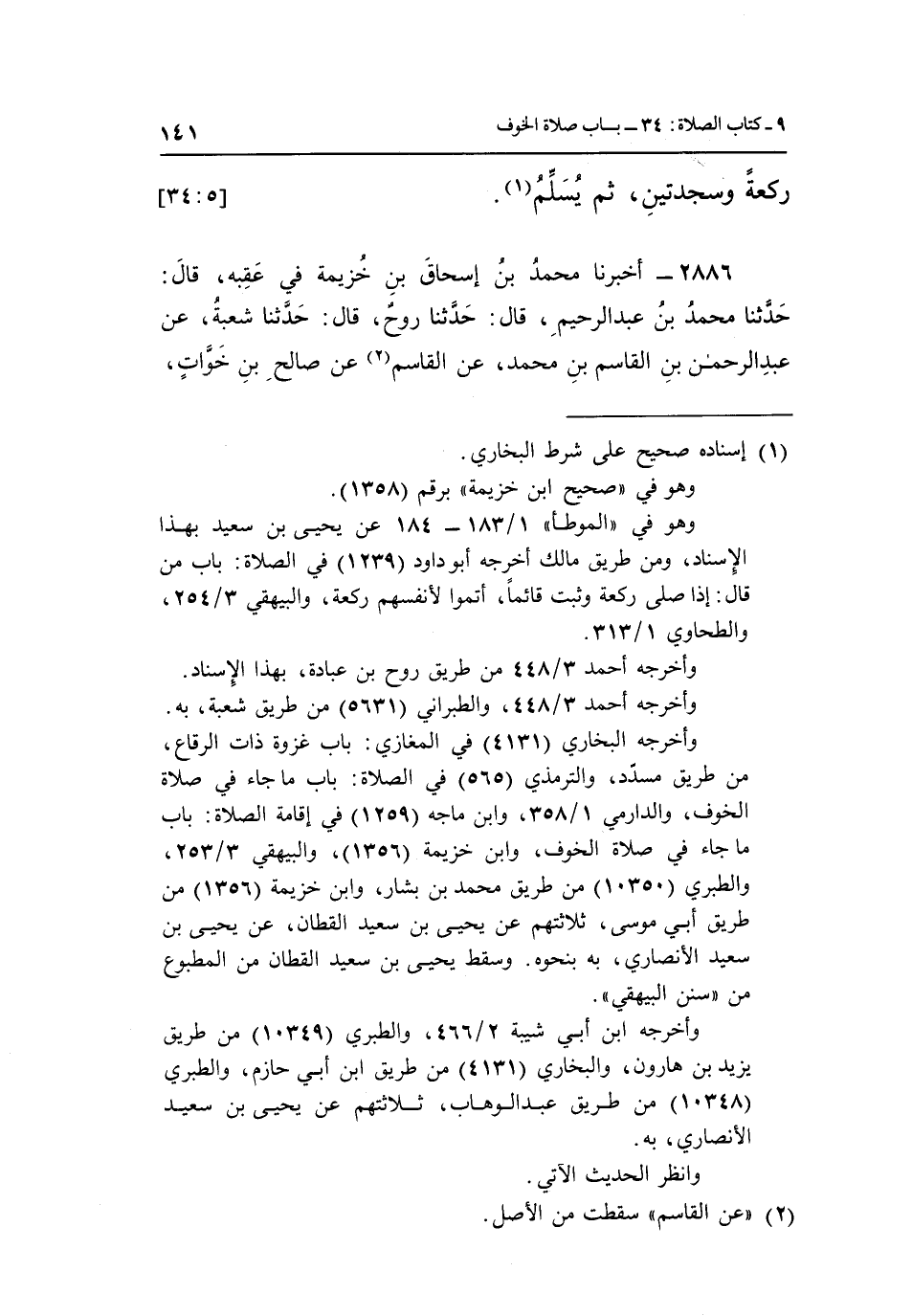 2886 - أَخْبَرَنَا مُحَمَّدُ بْنُ إِسْحَاقَ بْنِ خُزَيْمَةَ فِي عَقِبِهِ قَالَ حَدَّثَنَا مُحَمَّدُ بْنُ عَبْدِ الرَّحِيمِ قَالَ: حَدَّثَنَا رَوْحٌ قَالَ: حَدَّثَنَا شُعْبَةُ عَنْ عَبْدِ الرَّحْمَنِ بْنِ الْقَاسِمِ بْنِ مُحَمَّدٍ عَنِ القاسم2 عن صالح بن خوات