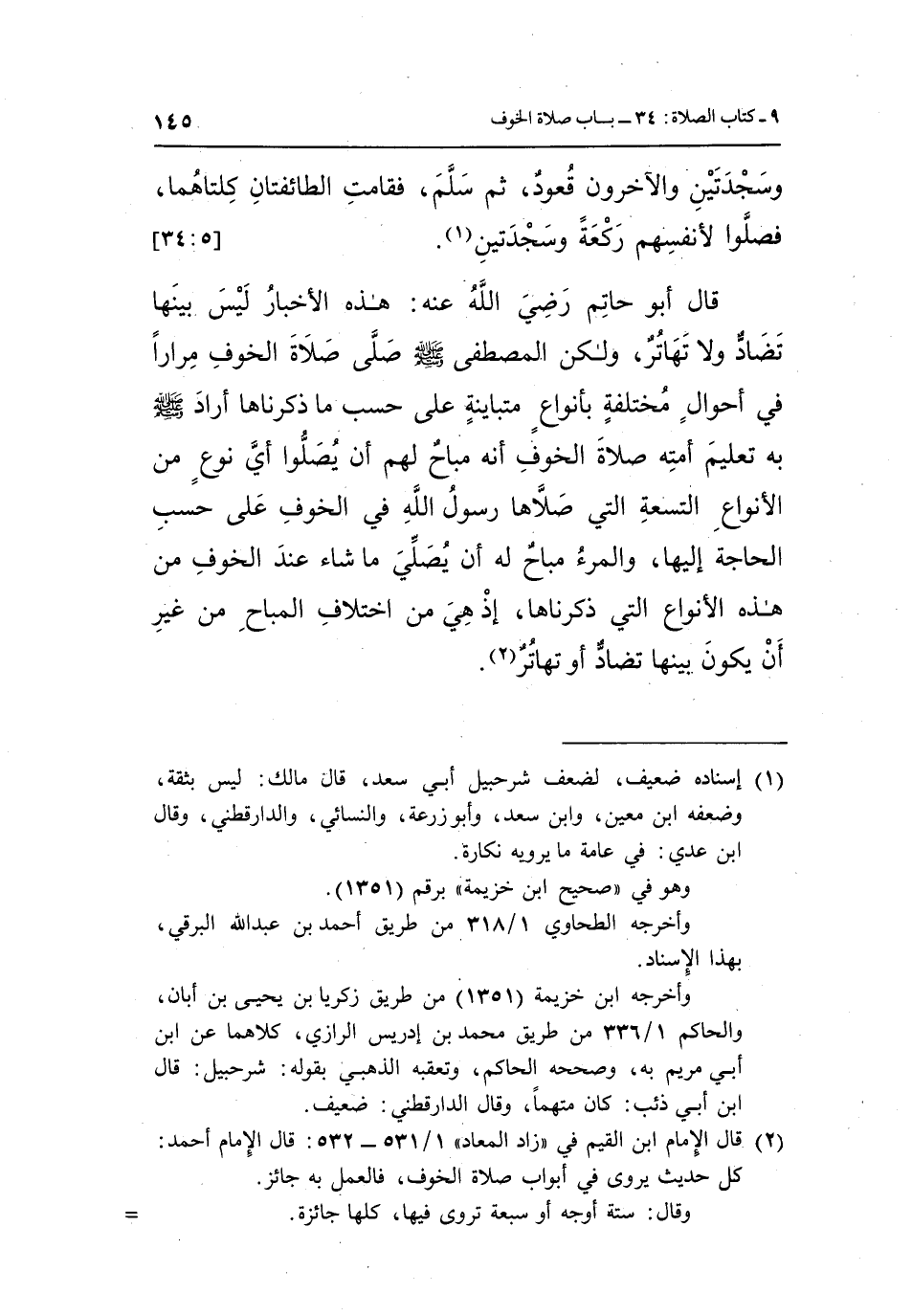 2 - قال الإمام ابن القيم في "زاد المعاد" "1/531-532": قال الإمام أحمد: كل حديث يروى في أبواب صلاة الخوف، فالعمل به جائز. وقال: ستة أو جه أو سبعة تروى فيها، كلها جائزة.
