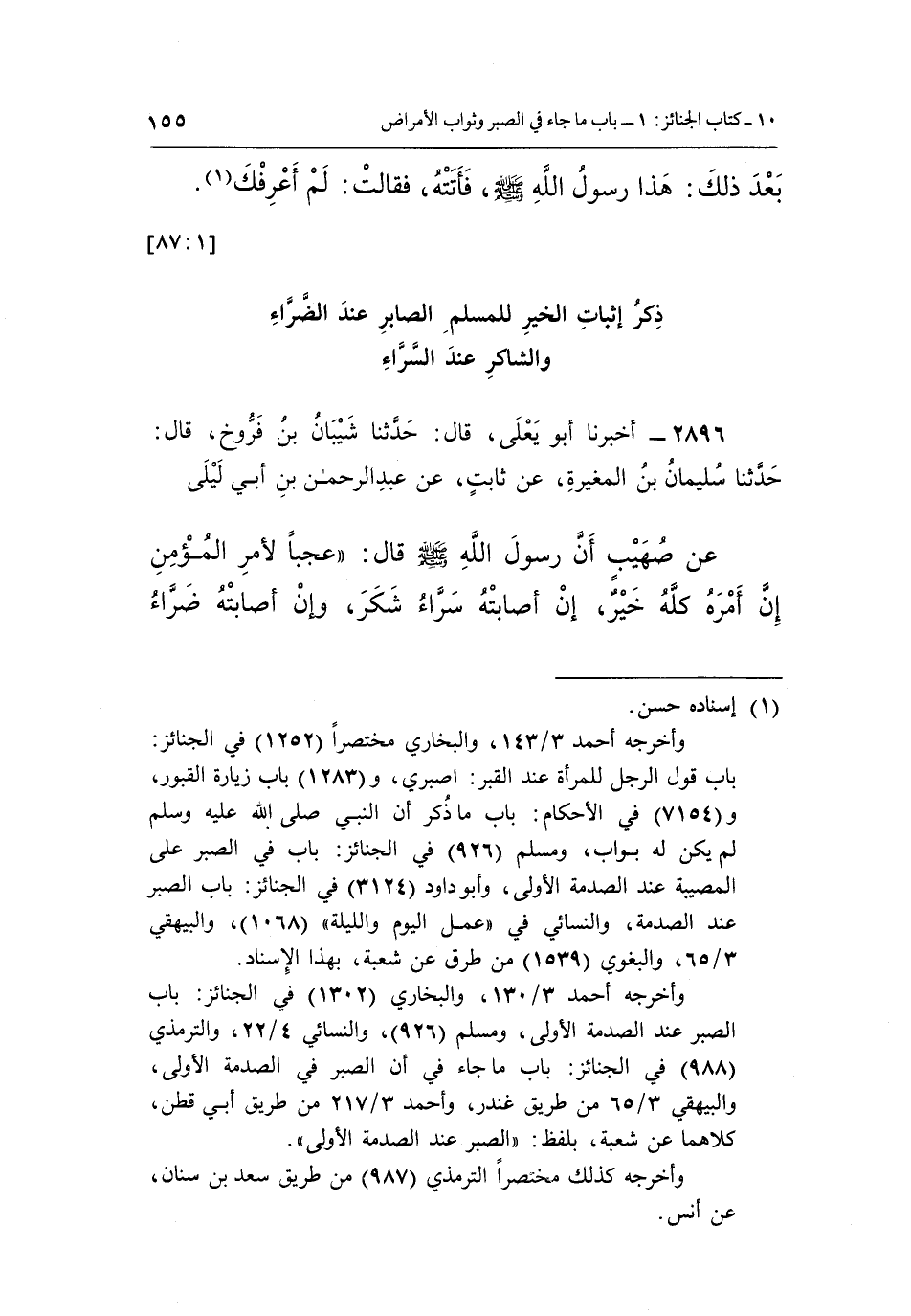 عَنْ صُهَيْبٍ أَنَّ رَسُولَ اللَّهِ صَلَّى اللَّهُ عَلَيْهِ وَسَلَّمَ قَالَ: "عَجَبًا لِأَمْرِ الْمُؤْمِنِ إِنَّ أَمْرَهُ كُلَّهُ خَيْرٌ إِنْ أَصَابَتْهُ سَرَّاءُ شَكَرَ وَإِنَّ أَصَابَتْهُ ضَرَّاءُ