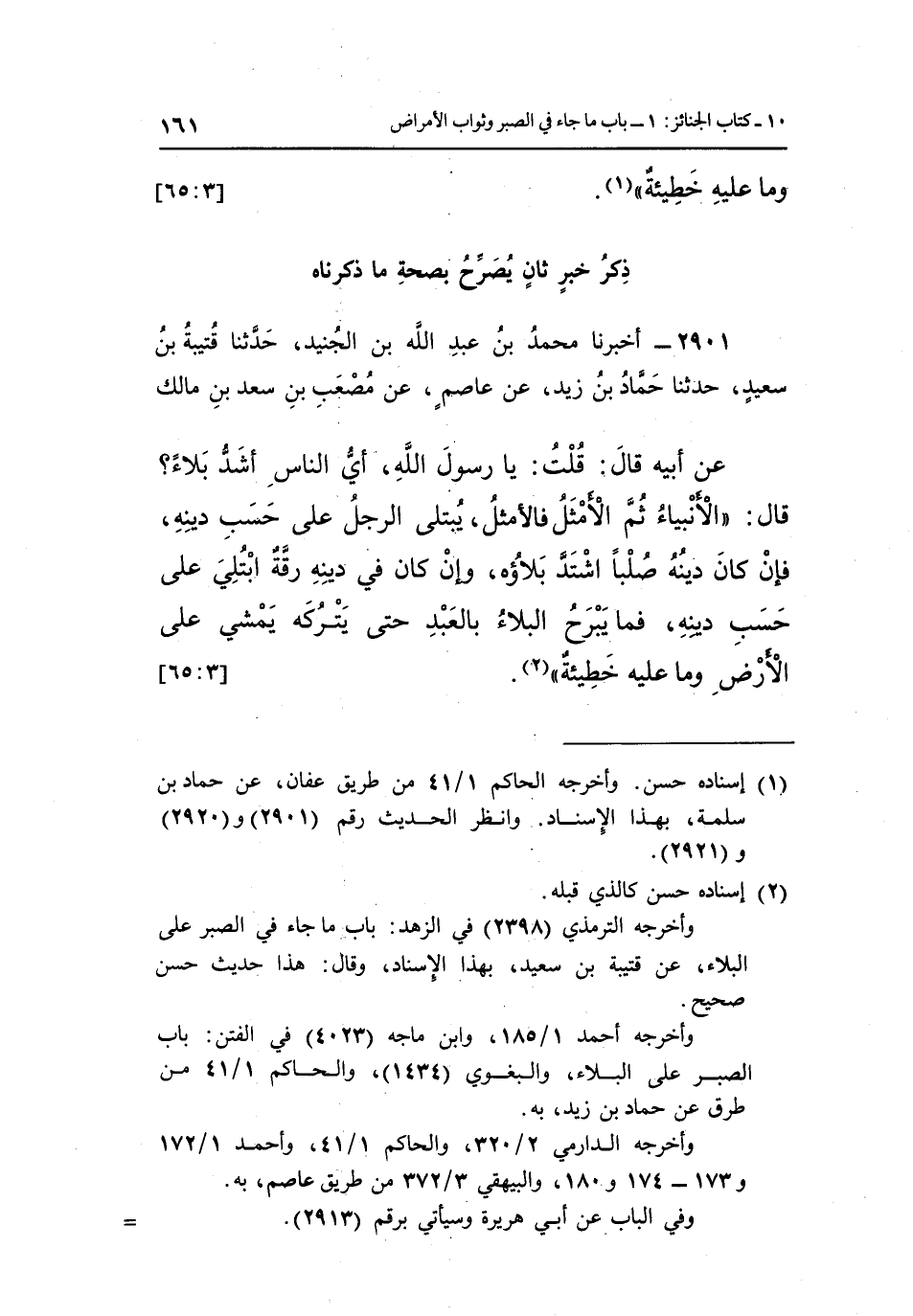 2901 - أَخْبَرَنَا مُحَمَّدُ بْنُ عَبْدِ اللَّهِ بْنِ الْجُنَيْدِ حَدَّثَنَا قُتَيْبَةُ بْنُ سَعِيدٍ حَدَّثَنَا حَمَّادُ بْنُ زَيْدٍ عَنْ عَاصِمٍ عَنْ مُصْعَبِ بْنِ سَعْدِ بْنِ مَالِكٍ عَنْ أَبِيهِ قَالَ: قُلْتُ: يَا رَسُولَ اللَّهِ أَيُّ النَّاسِ أَشَدُّ بَلَاءً قَالَ: "الْأَنْبِيَاءُ ثُمَّ الْأَمْثَلُ فَالْأَمْثَلُ يُبْتَلَى الرَّجُلُ عَلَى حَسَبِ دِينِهِ فَإِنْ كَانَ دِينُهُ صُلْبًا اشْتَدَّ بلاءه وَإِنْ كَانَ فِي دِينِهِ رِقَّةٌ ابْتُلِيَ عَلَى حَسَبِ دِينِهِ فَمَا يَبْرَحُ الْبَلَاءُ بِالْعَبْدِ حَتَّى يَتْرُكَهُ يَمْشِي عَلَى الْأَرْضِ وَمَا عَلَيْهِ خَطِيئَةٌ" 1. [65:3]