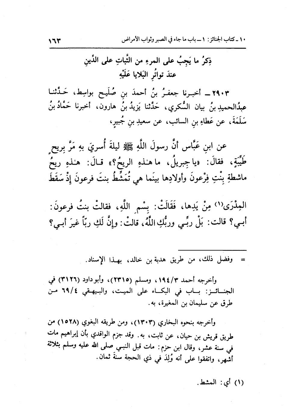 عن بن عَبَّاسٍ أَنَّ رَسُولَ اللَّهِ صَلَّى اللَّهُ عَلَيْهِ وَسَلَّمَ لَيْلَةَ أُسْرِيَ بِهِ مَرَّ بِرِيحٍ طَيْبَةٍ فَقَالَ: "يَا جِبْرِيلُ مَا هَذِهِ الرِّيحُ؟ " قَالَ: هَذِهِ رِيحُ مَاشِطَةِ بِنْتِ فِرْعَوْنَ وَأَوْلَادِهَا بَيْنَمَا هِيَ تَمْشُطُ بِنْتَ فِرْعَوْنَ إِذْ سَقَطَ الْمِدْرَى1 مِنْ يَدَهَا فَقَالَتْ: بِسْمِ اللَّهِ فَقَالَتْ بِنْتُ فِرْعَوْنَ: أَبِي؟ قَالَتْ: بَلْ رَبِّي وَرَبُّكِ اللَّهُ قالت: وإن لك ربا غير أبي؟