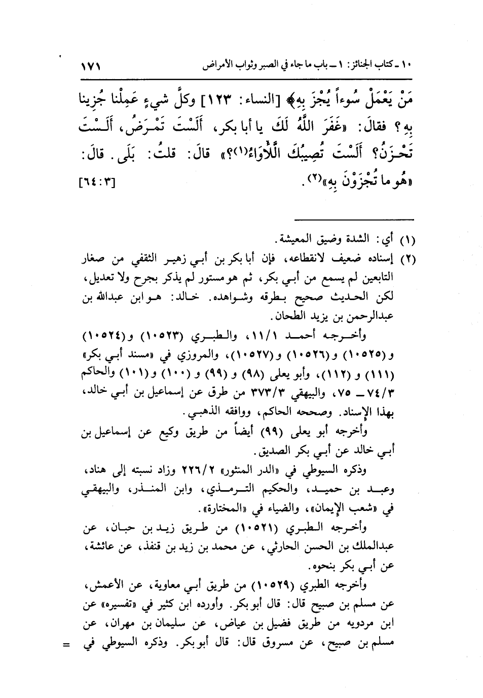 مَنْ يَعْمَلْ سُوءاً يُجْزَ بِهِ} [النساء:123] وَكُلُّ شَيْءٍ عَمِلْنَا جُزِينَا بِهِ؟ فَقَالَ: "غَفَرَ اللَّهُ لَكَ يَا أَبَا بَكْرٍ أَلَسْتَ تَمْرَضُ أَلَسْتَ تَحْزَنُ أَلَسْتَ تُصِيبُكَ اللَّأْوَاءُ 1" قَالَ: قُلْتُ: بَلَى, قال: "هو ما تجزون به" 2. [64:3]