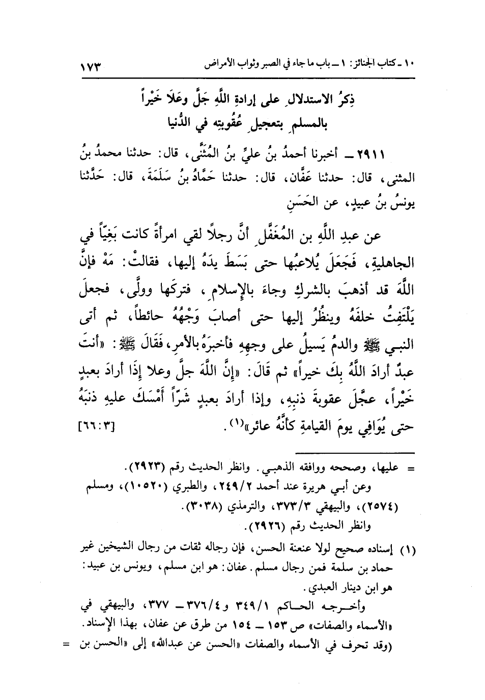 عَنْ عَبْدِ اللَّهِ بْنِ الْمُغَفَّلِ أَنَّ رَجُلًا لَقِيَ امْرَأَةَ كَانَتْ بَغِيًّا فِي الْجَاهِلِيَّةِ فَجَعَلَ يُلَاعِبُهَا حَتَّى بَسَطَ يَدَهُ إِلَيْهَا فَقَالَتْ مَهْ فَإِنَّ اللَّهَ قَدْ أَذْهَبَ بِالشِّرْكِ وَجَاءَ بِالْإِسْلَامِ فَتَرَكَهَا وَوَلَّى فَجَعَلَ يَلْتَفِتُ خَلْفَهُ وَيَنْظُرُ إِلَيْهَا حَتَّى أَصَابَ وَجْهُهُ حَائِطًا ثُمَّ أَتَى النَّبِيَّ صَلَّى اللَّهُ عَلَيْهِ وَسَلَّمَ وَالدَّمُ يَسِيلُ عَلَى وَجْهِهِ فَأَخْبَرَهُ بِالْأَمْرِ فَقَالَ صَلَّى اللَّهُ عَلَيْهِ وَسَلَّمَ: "أَنْتَ عَبْدٌ أَرَادَ اللَّهُ بِكَ خَيْرًا", ثُمَّ قَالَ: "إِنَّ اللَّهَ جَلَّ وَعَلَا إِذَا أَرَادَ بِعَبْدٍ خَيْرًا عَجَّلَ عُقُوبَةَ ذَنْبِهِ وَإِذَا أَرَادَ بِعَبْدٍ شَرًّا أَمْسَكَ عَلَيْهِ ذَنْبَهُ حَتَّى يُوَافِيَ يَوْمَ الْقِيَامَةِ كأنه عائر" 1. [66:3]
