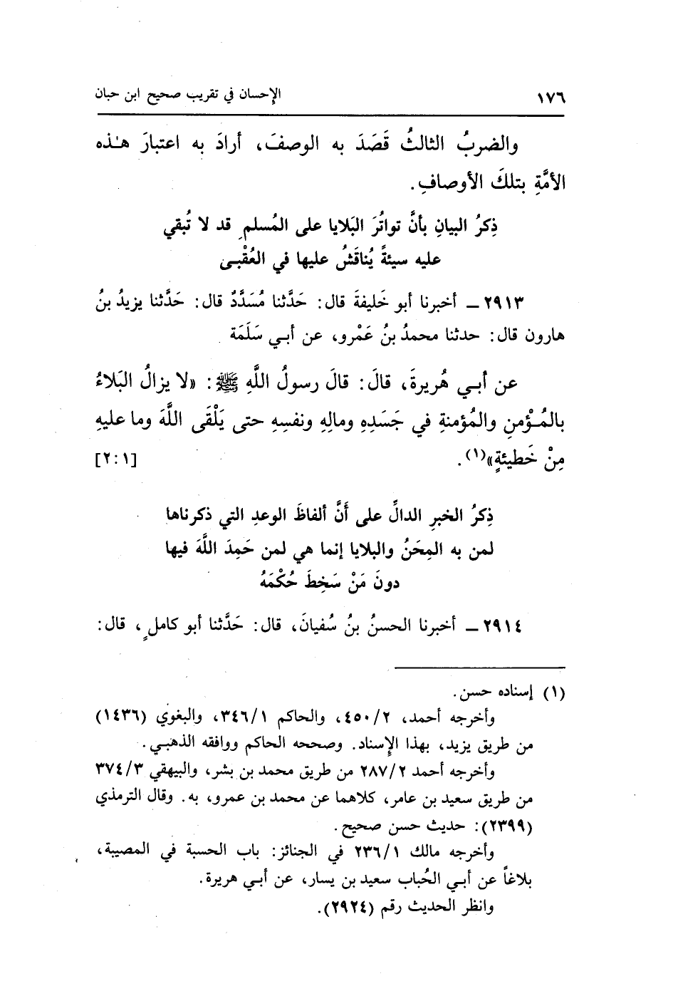 2913 - أَخْبَرَنَا أَبُو خَلِيفَةَ قَالَ: حَدَّثَنَا مُسَدَّدٌ قَالَ: حَدَّثَنَا يَزِيدُ بْنُ هَارُونَ قَالَ: حَدَّثَنَا مُحَمَّدُ بْنُ عَمْرٍو عَنْ أَبِي سَلَمَةَ عَنْ أَبِي هُرَيْرَةَ قَالَ: قَالَ رَسُولُ اللَّهِ صَلَّى اللَّهُ عَلَيْهِ وَسَلَّمَ: "لَا يَزَالُ الْبَلَاءُ بِالْمُؤْمِنِ وَالْمُؤْمِنَةِ فِي جَسَدِهِ وَمَالِهِ وَنَفْسِهِ حَتَّى يلقى الله وما عليه من خطيئة" 1. [2:1]
