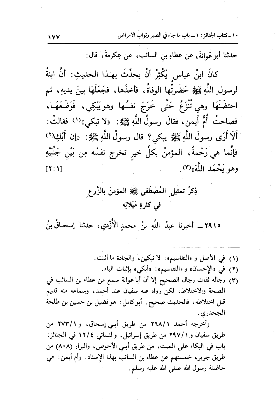 حَدَّثَنَا أَبُو عَوَانَةَ عَنْ عَطَاءِ بْنِ السَّائِبِ عن عكرمة قال: كان بن عَبَّاسٍ يُكْثِرُ أَنْ يُحَدِّثَ بِهَذَا الْحَدِيثِ: أَنَّ ابْنَةً لِرَسُولِ اللَّهِ صَلَّى اللَّهُ عَلَيْهِ وَسَلَّمَ حَضَرَتْهَا الْوَفَاةُ فَأَخَذَهَا فَجَعَلَهَا بَيْنَ يَدَيْهِ ثُمَّ احْتَضَنَهَا وَهِيَ تُنْزَعُ حَتَّى خَرَجَ نَفَسُهَا وَهُوَ يَبْكِي فَوَضَعَهَا فَصَاحَتْ أُمُّ أَيْمَنَ فَقَالَ رَسُولُ اللَّهِ صَلَّى اللَّهُ عَلَيْهِ وَسَلَّمَ: "لَا تَبْكِي" 1 فَقَالَتْ: أَلَا أَرَى رَسُولَ اللَّهِ صَلَّى اللَّهُ عَلَيْهِ وَسَلَّمَ يَبْكِي؟ قَالَ رَسُولُ اللَّهِ صَلَّى اللَّهُ عَلَيْهِ وَسَلَّمَ: "إِنَّ أَبْكِ 2 فَإِنَّمَا هِيَ رَحْمَةٌ الْمُؤْمِنُ بِكُلِّ خَيْرٍ تَخْرُجُ نَفْسُهُ مِنْ بين جنبيه وهو يحمد الله" 3. [2:1]