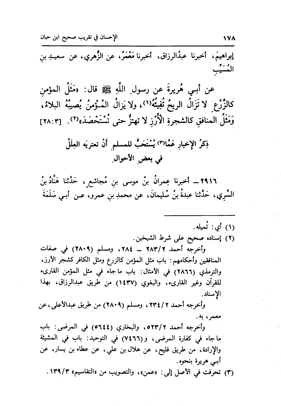 عَنْ أَبِي هُرَيْرَةَ عَنْ رَسُولِ اللَّهِ صَلَّى اللَّهُ عَلَيْهِ وَسَلَّمَ قَالَ: "مَثَلُ الْمُؤْمِنِ كَالزَّرْعِ لَا تَزَالُ الرِّيحُ تُفِيئُهُ 1 وَلَا يَزَالُ الْمُؤْمِنُ يُصِيبُهُ الْبَلَاءُ وَمَثَلُ الْمُنَافِقِ كَالشَّجَرَةِ الْأَرْزِ لَا تَهْتَزُّ حَتَّى تستحصد" 2. [28:3]