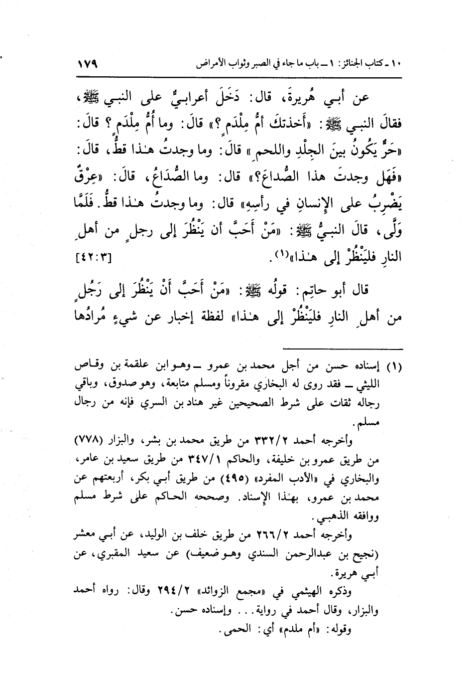 عَنْ أَبِي هُرَيْرَةَ قَالَ: دَخَلَ أَعْرَابِيٌّ عَلَى النَّبِيِّ صَلَّى اللَّهُ عَلَيْهِ وَسَلَّمَ فَقَالَ النَّبِيُّ صَلَّى اللَّهُ عَلَيْهِ وَسَلَّمَ: "أَخَذَتْكَ أُمُّ مِلْدَمٍ؟ " قَالَ: وَمَا أُمُّ مِلْدَمٍ؟ قَالَ: "حَرٌّ يَكُونُ بَيْنَ الْجِلْدِ وَاللَّحْمِ" قَالَ: وَمَا وَجَدْتُ هَذَا قَطُّ قَالَ: "فَهَلْ وَجَدْتَ هَذَا الصُّدَاعَ؟ " قَالَ: وَمَا الصُّدَاعُ؟ قَالَ: "عِرْقٌ يَضْرِبُ عَلَى الْإِنْسَانِ فِي رَأْسِهِ" قَالَ: وَمَا وَجَدْتَ هَذَا قَطُّ فَلَمَّا وَلَّى قَالَ النَّبِيُّ صَلَّى اللَّهُ عَلَيْهِ وَسَلَّمَ: "مَنْ أَحَبَّ أَنْ يَنْظُرَ إِلَى رَجُلٍ مِنْ أَهْلِ النَّارِ فَلْيَنْظُرْ إِلَى هَذَا" 1. [42:3]