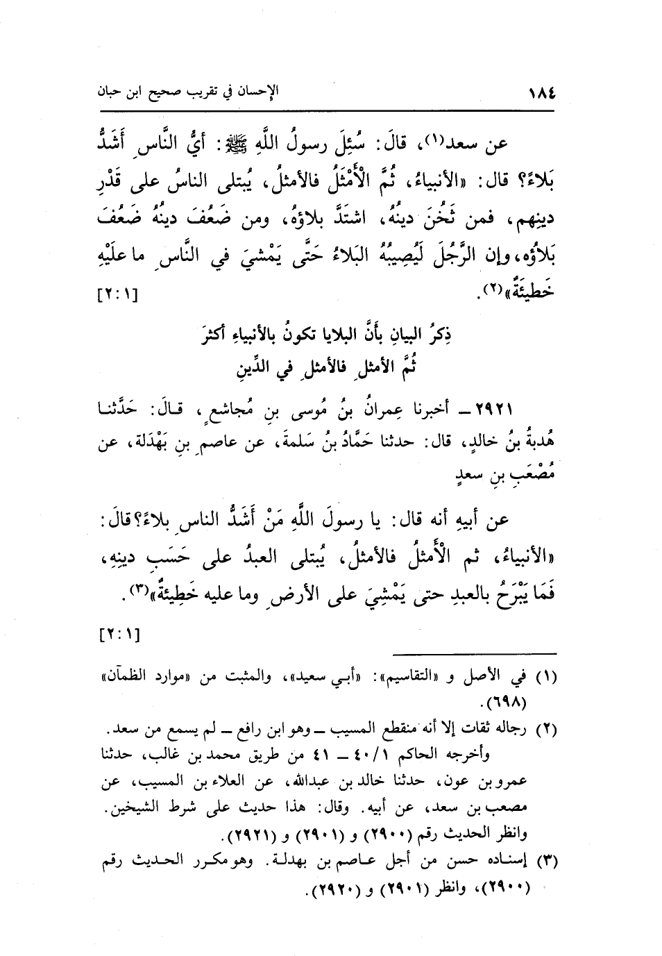 ذِكْرُ الْبَيَانِ بِأَنَّ الْبَلَايَا تَكُونُ بِالْأَنْبِيَاءِ أَكْثَرُ ثُمَّ الْأَمْثَلِ فَالْأَمْثَلِ فِي الدِّينِ