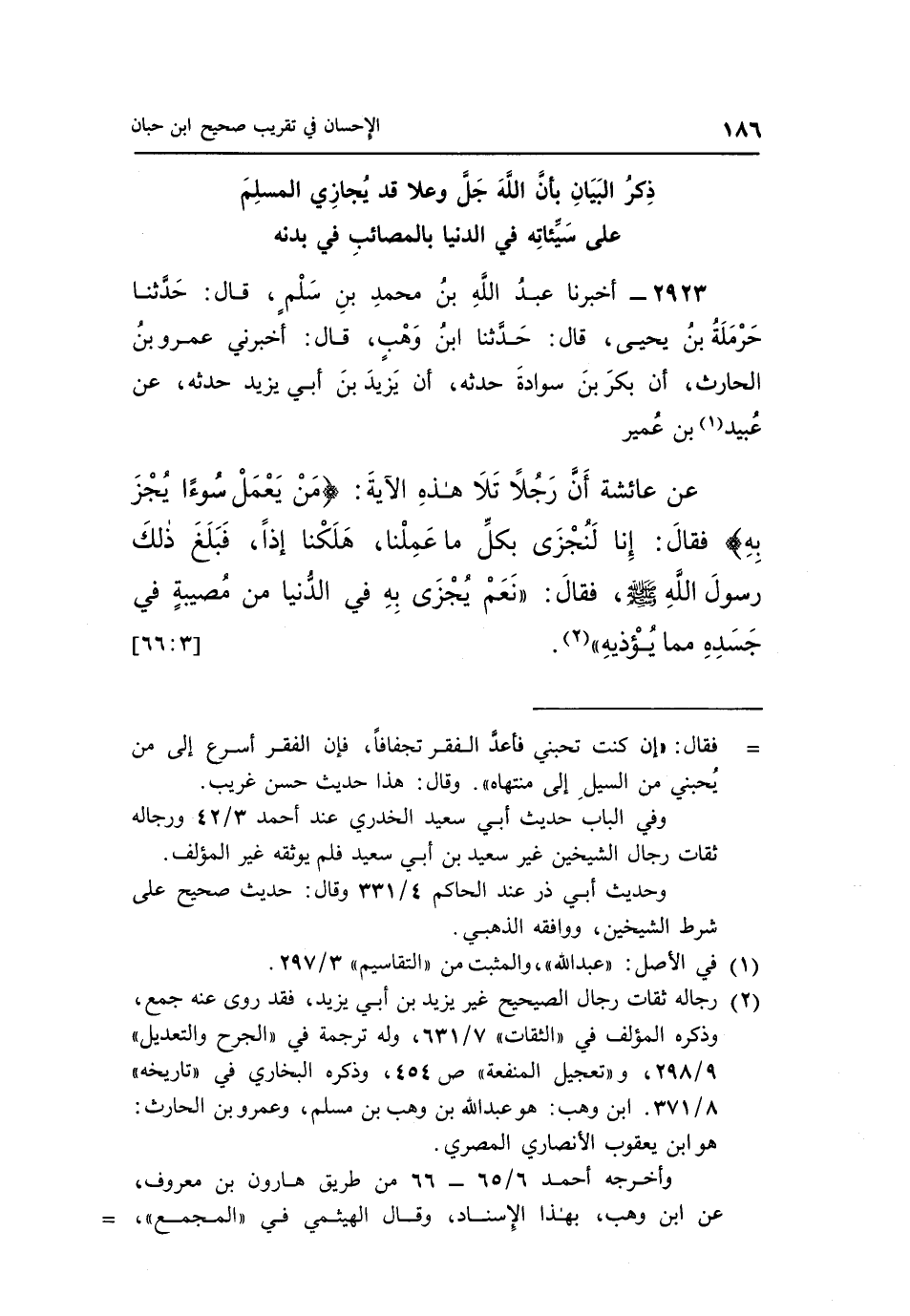 2923 - أَخْبَرَنَا عَبْدُ اللَّهِ بْنُ مُحَمَّدِ بْنِ سَلْمٍ قَالَ: حَدَّثَنَا حَرْمَلَةُ بْنُ يَحْيَى قَالَ: حَدَّثَنَا بن وَهْبٍ قَالَ: أَخْبَرَنِي عَمْرُو بْنُ الْحَارِثِ أَنَّ بَكْرَ بْنَ سَوَادَةَ حَدَّثَهُ أَنَّ يَزِيدَ بْنَ أَبِي يَزِيدَ حَدَّثَهُ عَنْ عُبَيْدِ1 بْنِ عُمَيْرٍ