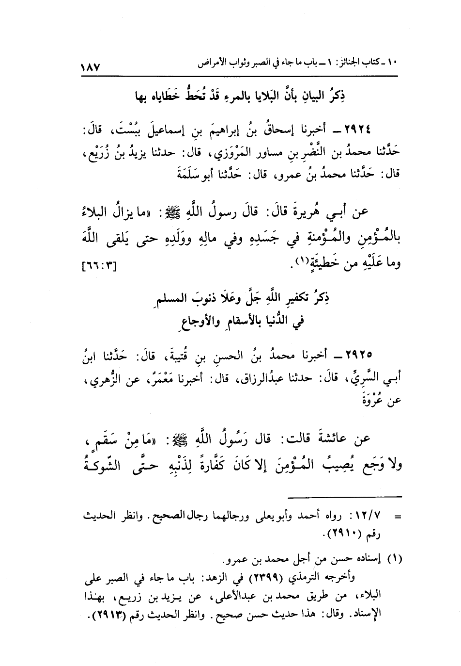 عَنْ أَبِي هُرَيْرَةَ قَالَ: قَالَ رَسُولُ اللَّهِ صَلَّى اللَّهُ عَلَيْهِ وَسَلَّمَ: "مَا يَزَالُ الْبَلَاءُ بِالْمُؤْمِنِ وَالْمُؤْمِنَةِ فِي جَسَدِهِ وَفِي مَالِهِ وَوَلَدِهِ حَتَّى يَلْقَى اللَّهَ وَمَا عليه من خطيئة" 1. [66:3]