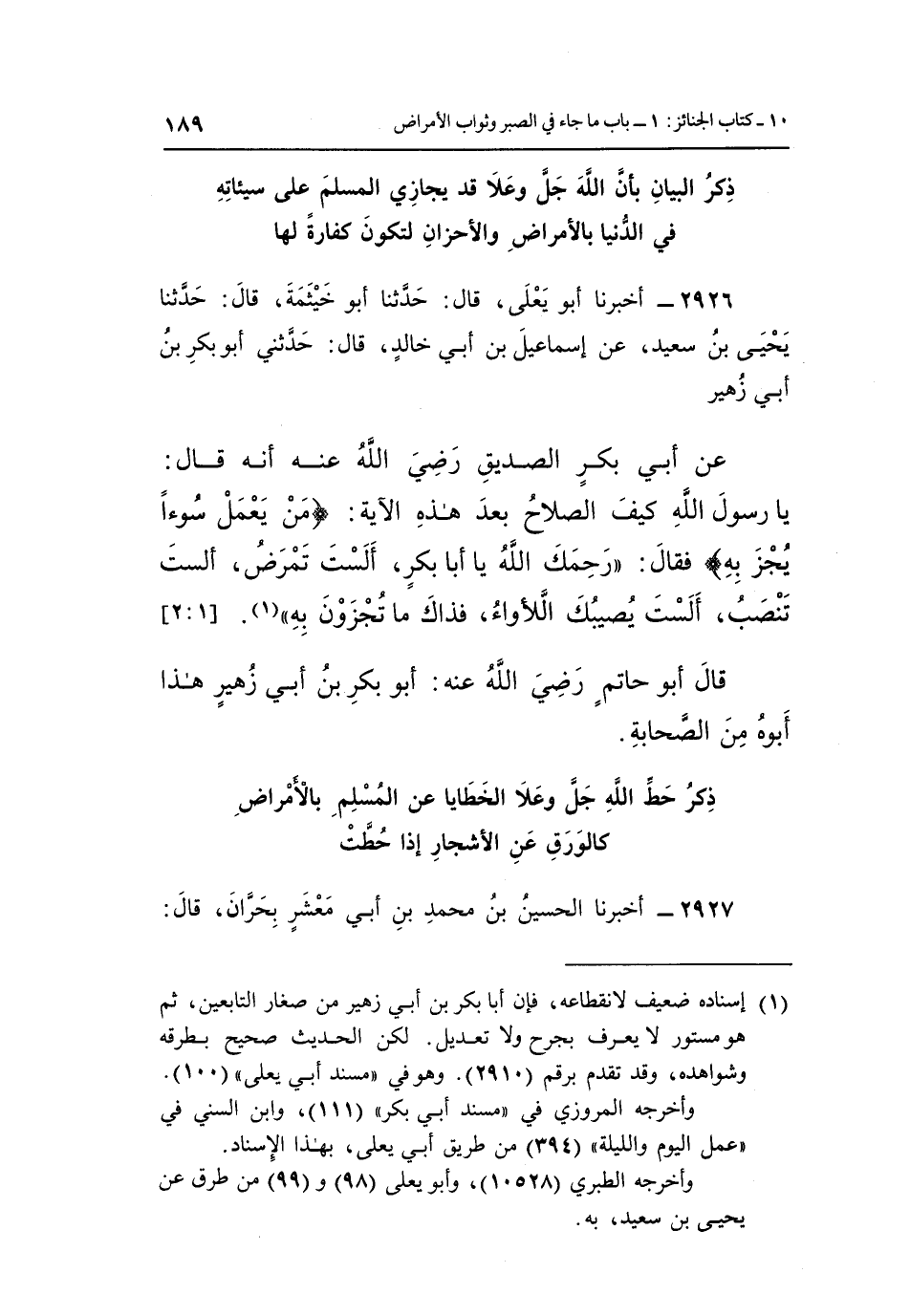 2926 - أَخْبَرَنَا أَبُو يَعْلَى قَالَ: حَدَّثَنَا أَبُو خَيْثَمَةَ قَالَ: حَدَّثَنَا يَحْيَى بْنُ سَعِيدٍ عَنْ إِسْمَاعِيلَ بْنِ أَبِي خَالِدٍ قَالَ: حَدَّثَنِي أَبُو بَكْرِ بْنِ أَبِي زُهَيْرٍ عن أبي بكر الصديق رضى الله تعالى عَنْهُ أَنَّهُ قَالَ: يَا رَسُولَ اللَّهِ كَيْفَ الصَّلَاحُ بَعْدَ هَذِهِ الْآيَةِ: {مَنْ يَعْمَلْ سُوءاً يُجْزَ بِهِ} فَقَالَ: "رَحِمَكَ اللَّهُ يَا أَبَا بَكْرٍ أَلَسْتَ تَمْرَضُ أَلَسْتَ تَنْصَبُ أَلَسْتَ يُصِيبُكَ اللَّأْوَاءُ فَذَاكَ مَا تُجْزَوْنَ بِهِ" 1. [2:1]