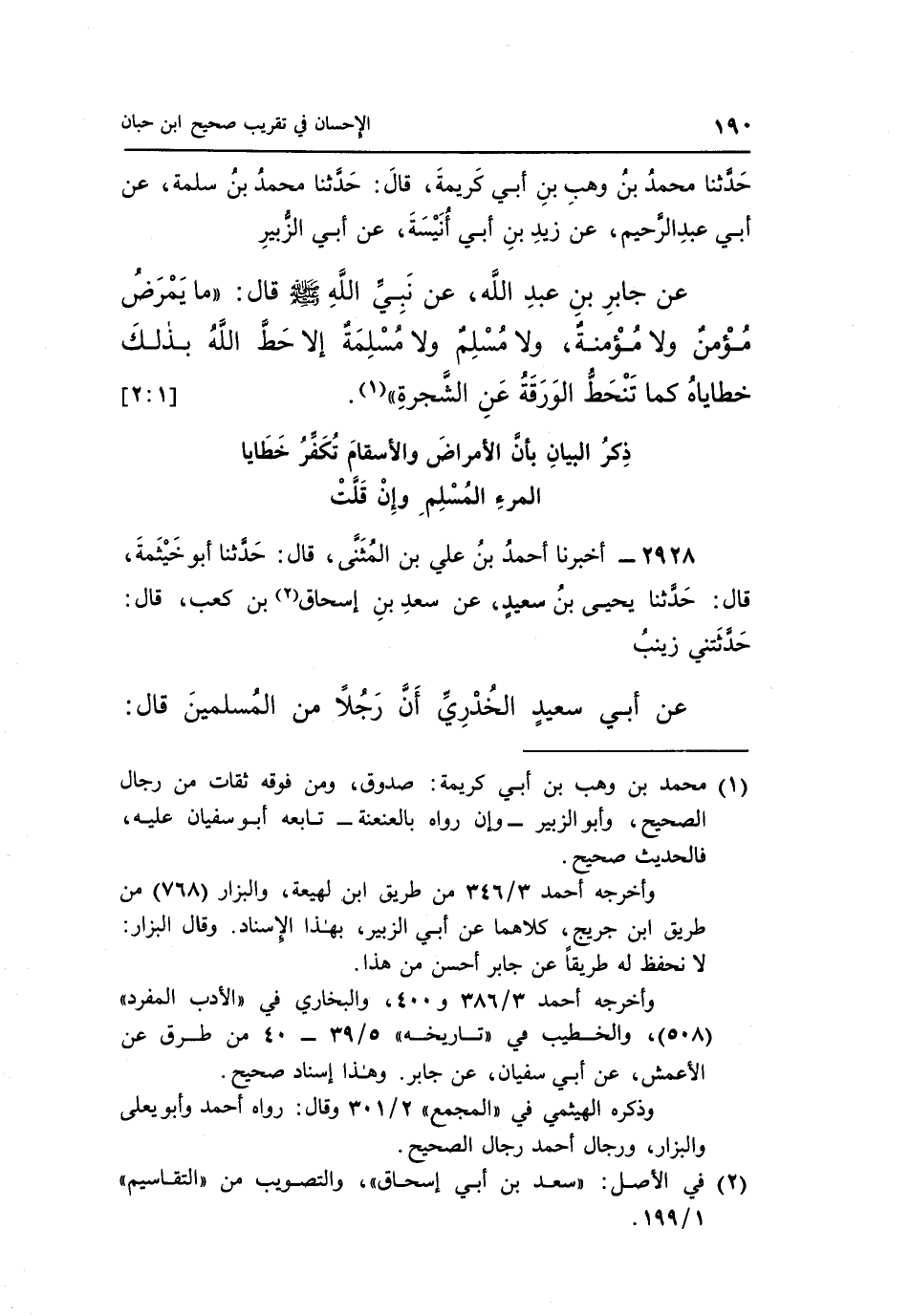 عَنْ جَابِرِ بْنِ عَبْدِ اللَّهِ عَنْ نَبِيِّ اللَّهِ صَلَّى اللَّهُ عَلَيْهِ وَسَلَّمَ قَالَ: "مَا يَمْرَضُ مُؤْمِنٌ وَلَا مُؤْمِنَةٌ وَلَا مُسْلِمٌ وَلَا مَسْلَمَةٌ إِلَّا حَطَّ اللَّهُ بِذَلِكَ خَطَايَاهُ كَمَا تَنْحَطُّ الْوَرَقَةُ عَنِ الشَّجَرَةِ" 1. [2:1]