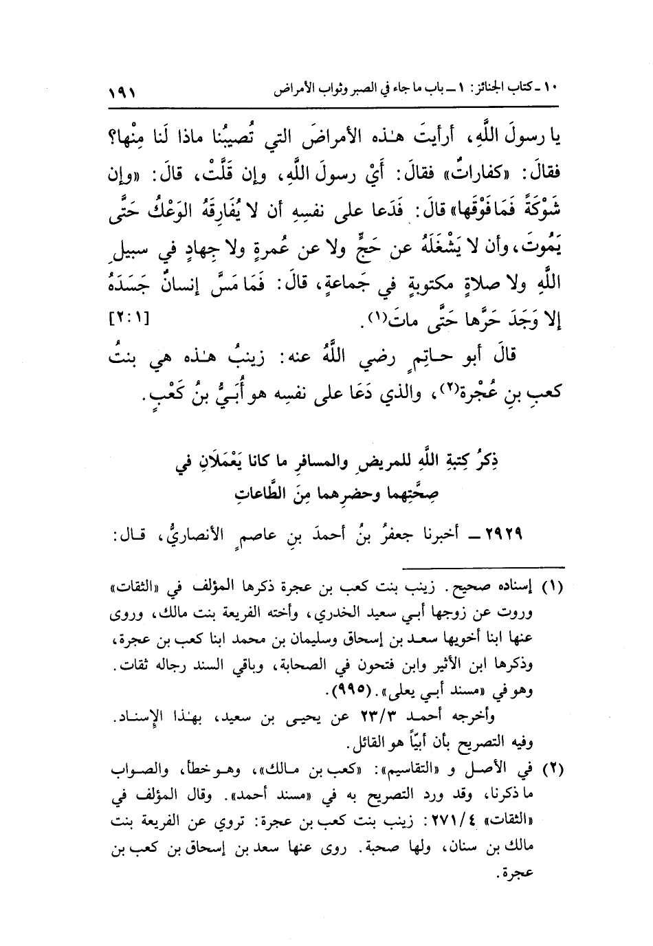 قَالَ أبو حاتم رضى الله تعالى عَنْهُ: زَيْنَبُ هَذِهِ هِيَ بِنْتُ كَعْبِ بْنِ عُجْرَةَ2 وَالَّذِي دَعَا عَلَى نَفْسِهِ هُوَ أُبَيُّ بن كعب.