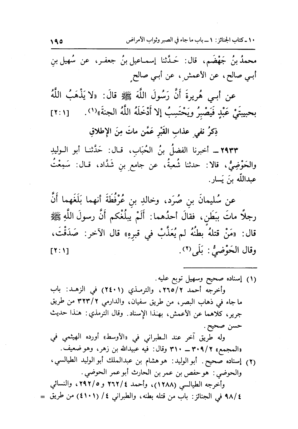 مُحَمَّدُ بْنُ جَهْضَمٍ قَالَ حَدَّثَنَا إِسْمَاعِيلُ بْنُ جعفر عن سهيل بن أبي صالح عَنِ الْأَعْمَشِ عَنْ أَبِي صَالِحٍ عَنْ أَبِي هُرَيْرَةَ أَنَّ رَسُولَ اللَّهِ صَلَّى اللَّهُ عَلَيْهِ وسلم قَالَ: "لَا يَذْهَبُ اللَّهُ بِحَبِيبَتَيْ عَبْدٍ فَيَصْبِرُ ويحتسب إلا أدخله الله الجنة" 1. [2:1]