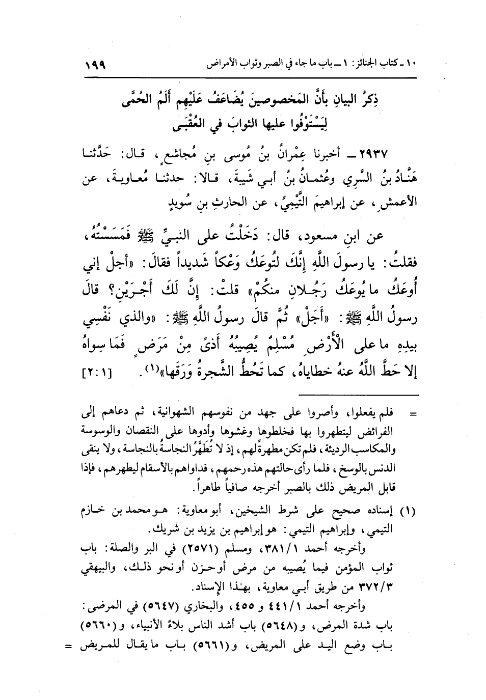 عن بن مَسْعُودٍ قَالَ: دَخَلْتُ عَلَى النَّبِيِّ صَلَّى اللَّهُ عَلَيْهِ وَسَلَّمَ فَمَسِسْتُهُ فَقُلْتُ: يَا رَسُولَ اللَّهِ إِنَّكَ لَتُوعَكُ وَعْكًا شَدِيدًا فَقَالَ: "أَجَلْ إِنِّي أُوعَكُ مَا يُوعَكُ رَجُلَانِ مِنْكُمْ" قُلْتُ: إِنَّ لَكَ أَجْرَيْنِ؟ قَالَ رَسُولُ اللَّهِ صَلَّى اللَّهُ عَلَيْهِ وَسَلَّمَ: "أَجَلْ" ثُمَّ قَالَ رَسُولُ اللَّهِ صَلَّى اللَّهُ عَلَيْهِ وَسَلَّمَ: "وَالَّذِي نَفْسِي بِيَدِهِ مَا عَلَى الْأَرْضِ مُسْلِمٌ يُصِيبُهُ أَذًى مِنْ مَرَضٍ فَمَا سِوَاهُ إِلَّا حَطَّ اللَّهُ عَنْهُ خطاياه كما تحط الشجرة ورقها" 1. [2:1]