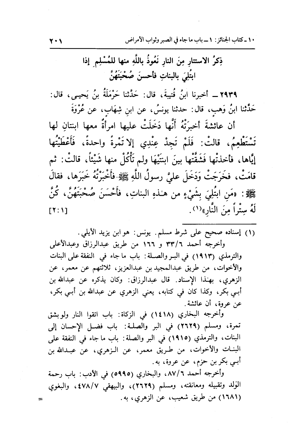 أَنَّ عَائِشَةَ أَخْبَرَتْهُ أَنَّهَا دَخَلَتْ عَلَيْهَا امْرَأَةٌ مَعَهَا ابْنَتَانِ لَهَا تَسْتَطْعِمُ، قَالَتْ: فَلَمْ تَجِدْ عِنْدِي إِلَّا تَمْرَةً وَاحِدَةً، فأعطيتها إياها فأخذتها فشقها بَيْنَ ابْنَتَيْهَا وَلَمْ تَأْكُلْ مِنْهَا شَيْئًا، قَالَتْ: ثُمَّ قَامَتْ فَخَرَجَتْ وَدَخَلَ عَلَى رَسُولِ اللَّهِ صَلَّى اللَّهُ عَلَيْهِ وَسَلَّمَ فَأَخْبَرْتُهُ خَبَرَهَا، فَقَالَ صَلَّى اللَّهُ عَلَيْهِ وَسَلَّمَ: "مَنِ ابْتُلِيَ بِشَيْءٍ مِنْ هَذِهِ الْبَنَاتِ فَأَحْسَنَ صُحْبَتَهُنَّ كُنَّ لَهُ سترا من النار" 1. [2:1]