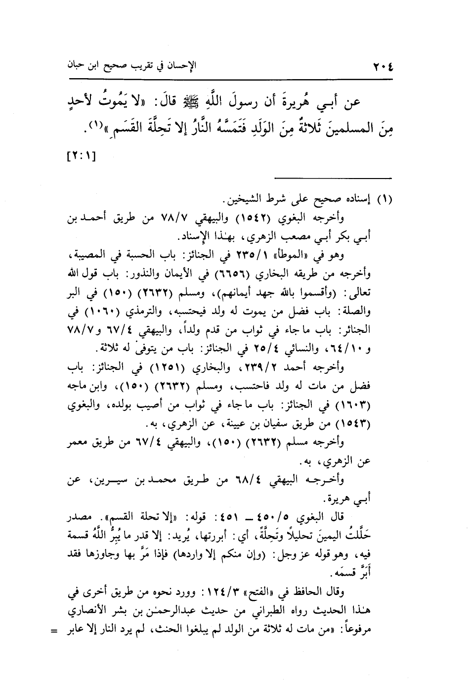 عَنْ أَبِي هُرَيْرَةَ أَنَّ رَسُولَ اللَّهِ صَلَّى اللَّهُ عَلَيْهِ وَسَلَّمَ قَالَ: "لَا يَمُوتُ لِأَحَدٍ مِنَ الْمُسْلِمِينَ ثَلَاثَةٌ مِنَ الْوَلَدِ فَتَمَسَّهُ النَّارُ إلا تحلة القسم" 1. [2:1]