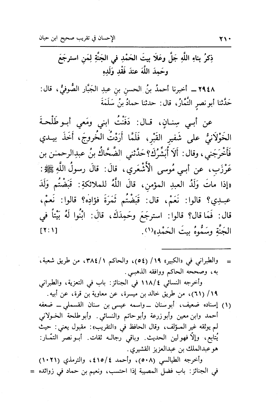 عَنْ أَبِي سِنَانٍ قَالَ: دَفَنْتُ ابْنِي وَمَعِي أَبُو طَلْحَةَ الْخَوْلَانِيُّ عَلَى شَفِيرِ الْقَبْرِ فَلَمَّا أَرَدْتُ الخروج أخذ بيدي فأخبرني وَقَالَ: أَلَا أُبَشِّرُكَ؟ حَدَّثَنِي الضَّحَّاكُ بْنُ عَبْدِ الرَّحْمَنِ بْنِ عَرْزَبٍ عَنْ أَبِي مُوسَى الْأَشْعَرِيِّ قَالَ: قَالَ رَسُولُ اللَّهِ صَلَّى اللَّهُ عَلَيْهِ وَسَلَّمَ: "إِذَا مَاتَ وَلَدُ الْعَبْدِ الْمُؤْمِنِ قَالَ الله لملائكته قَبَضْتُمْ وَلَدَ عَبْدِي؟ قَالُوا: نَعَمْ, قَالَ: قَبَضْتُمْ ثَمَرَةَ فُؤَادِهِ؟ قَالُوا: نَعَمْ, قَالَ: فَمَا قَالَ؟ قَالُوا: اسْتَرْجَعَ وَحَمِدَكَ, قَالَ: أَبَنُوا لَهُ بَيْتًا في الجنة وسموه بيت الحمد" 1. [2:1]