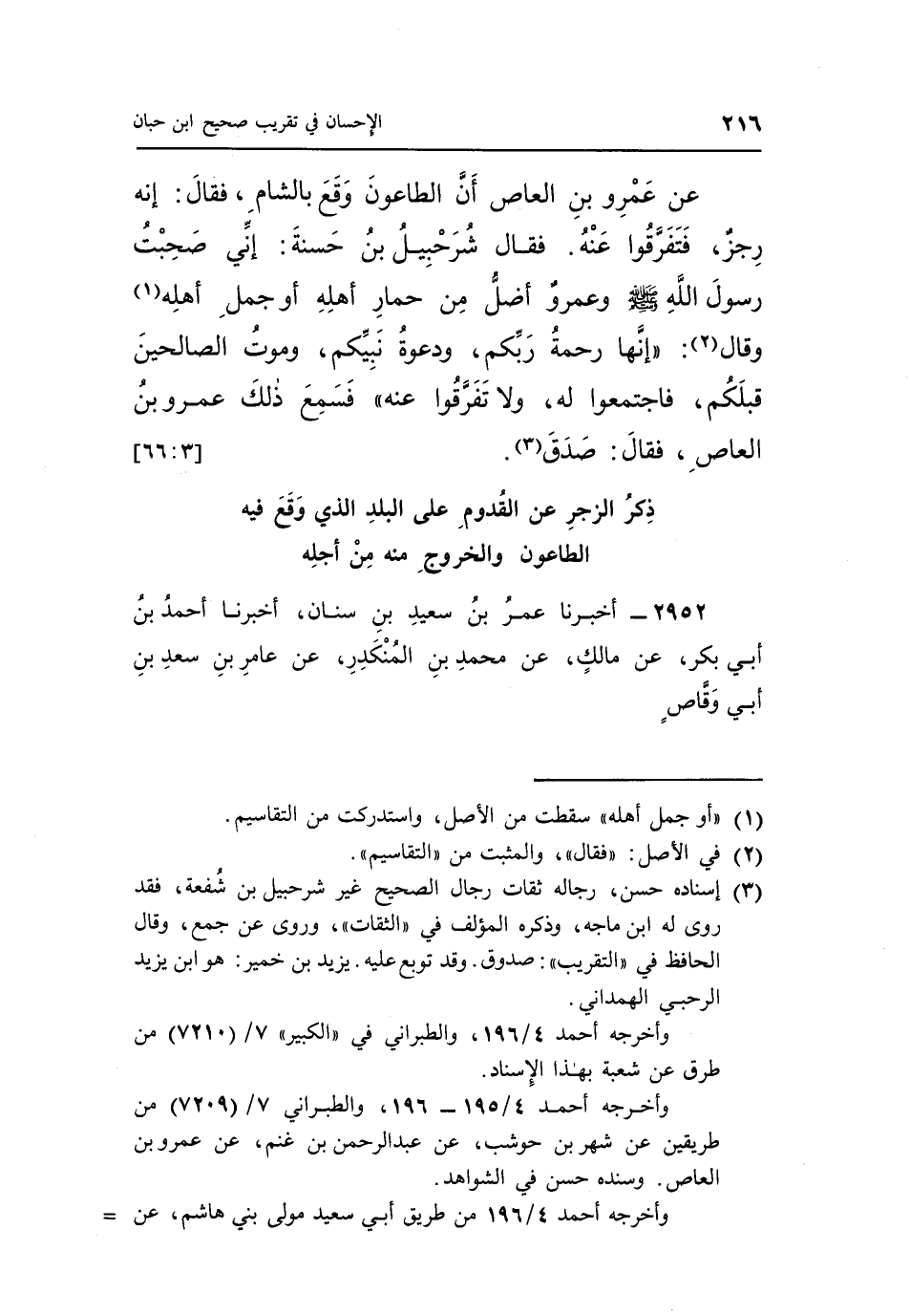 عَنْ عَمْرِو بْنِ الْعَاصِ أَنَّ الطَّاعُونَ وَقَعَ بِالشَّامِ فَقَالَ إِنَّهُ رِجْزٌ فَتَفَرَّقُوا عَنْهُ فَقَالَ شُرَحْبِيلُ بْنُ حَسَنَةَ إِنِّي صَحِبْتَ رَسُولَ اللَّهِ صَلَّى اللَّهُ عَلَيْهِ وَسَلَّمَ وَعَمْرٌو أَضَلُّ مِنْ حِمَارِ أَهْلِهِ أَوْ جَمَلِ أَهْلِهِ1 وَقَالَ2: "إِنَّهَا رَحْمَةٌ رَبِّكُمْ وَدَعْوَةٌ نَبِيِّكُمْ وَمَوْتُ الصَّالِحِينَ قَبْلَكُمْ فَاجْتَمِعُوا لَهُ وَلَا تَفَرَّقُوا عَنْهُ" فَسَمِعَ ذَلِكَ عمرو بن العاص فقال: صدق3. [66:3]