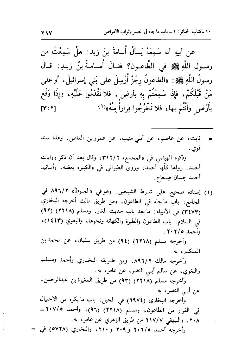 عَنْ أَبِيهِ أَنَّهُ سَمِعَهُ يَسْأَلُ أُسَامَةَ بْنَ زَيْدٍ هَلْ سَمِعْتُ مِنْ رَسُولِ اللَّهِ صَلَّى اللَّهُ عَلَيْهِ وَسَلَّمَ فِي الطَّاعُونِ فَقَالَ أُسَامَةُ بْنُ زَيْدٍ: قَالَ رَسُولُ اللَّهِ صَلَّى اللَّهُ عَلَيْهِ وَسَلَّمَ: "الطَّاعُونُ رِجْزٌ أُرْسِلَ عَلَى بَنِي إِسْرَائِيلَ أَوْ عَلَى مَنْ قَبْلَكُمْ فَإِذَا سَمِعْتُمْ بِهِ بِأَرْضٍ فَلَا تَقْدُمُوا عَلَيْهِ وَإِذَا وَقَعَ بِأَرْضٍ وَأَنْتُمْ بِهَا فَلَا تَخْرُجُوا فِرَارًا مِنْهُ" 1. [3:2]