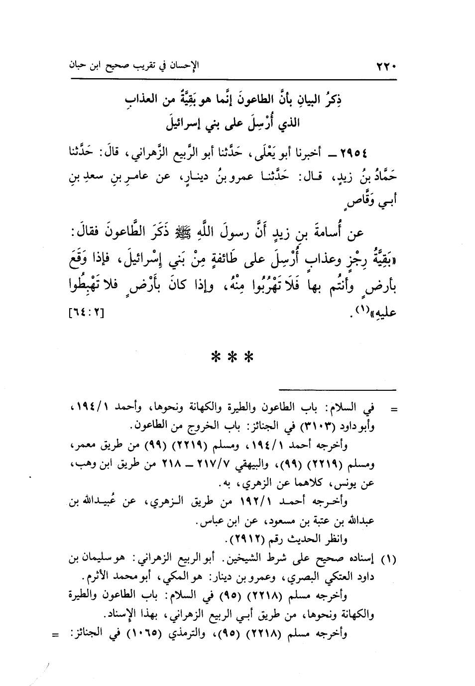 عَنْ أَسَامَةَ بْنِ زَيْدٍ أَنَّ رَسُولَ اللَّهِ صَلَّى اللَّهُ عَلَيْهِ وسلم ذَكَرَ الطَّاعُونَ فَقَالَ: "بَقِيَّةُ رِجْزٍ وَعَذَابٌ أُرْسِلَ عَلَى طَائِفَةٍ مِنْ بَنِي إِسْرَائِيلَ فَإِذَا وَقَعَ بِأَرْضٍ وَأَنْتُمْ بِهَا فَلَا تَهْرَبُوا مِنْهُ وَإِذَا كان بأرض فلا تهبطوا عليه" 1. [64:2]