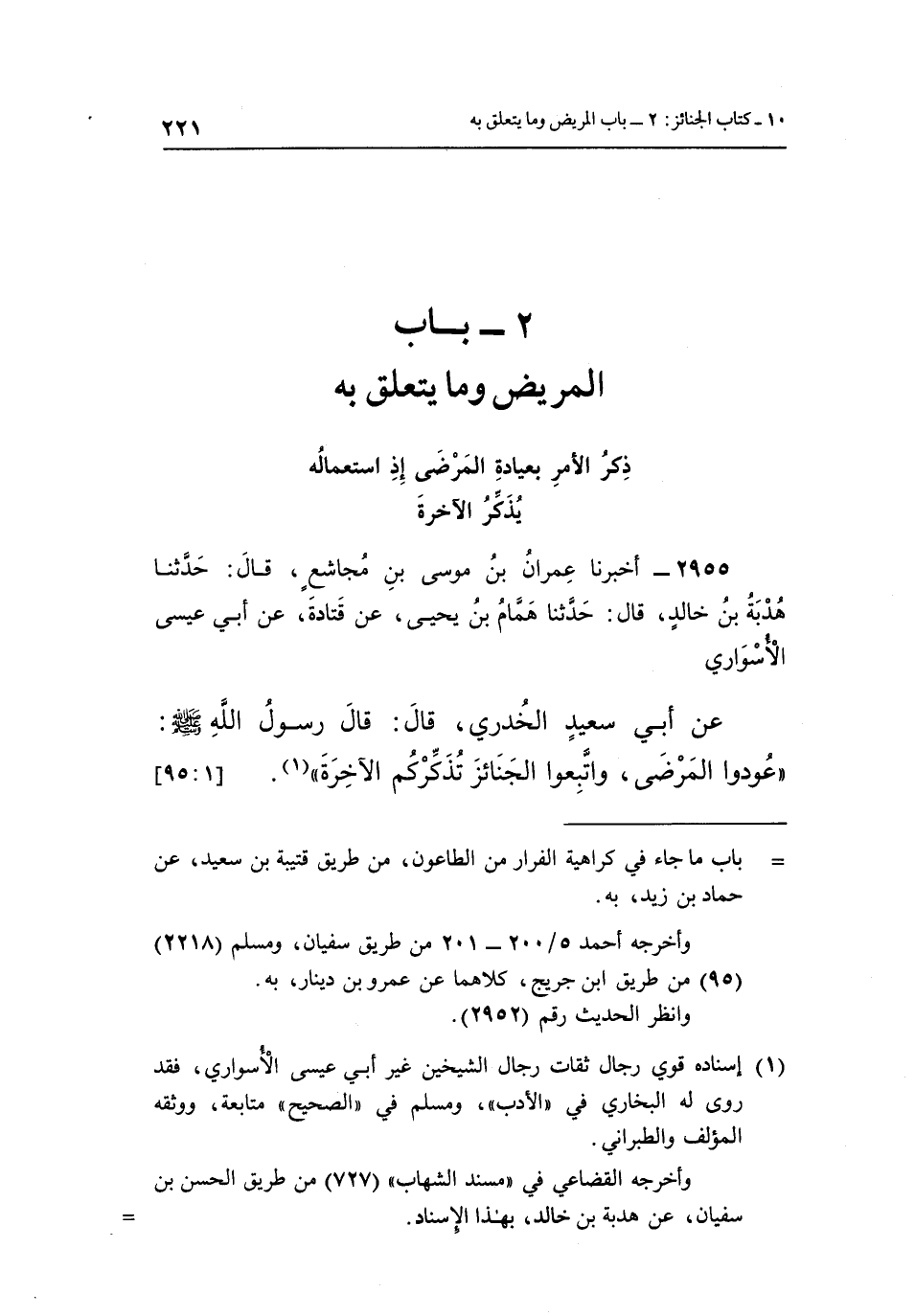 عَنْ أَبِي سَعِيدٍ الْخُدْرِيِّ قَالَ: قَالَ رَسُولُ اللَّهِ صَلَّى اللَّهُ عَلَيْهِ وَسَلَّمَ: "عُودُوَا الْمَرْضَى واتبعوا الجنائز تذكركم الآخرة" 1. [95:1]