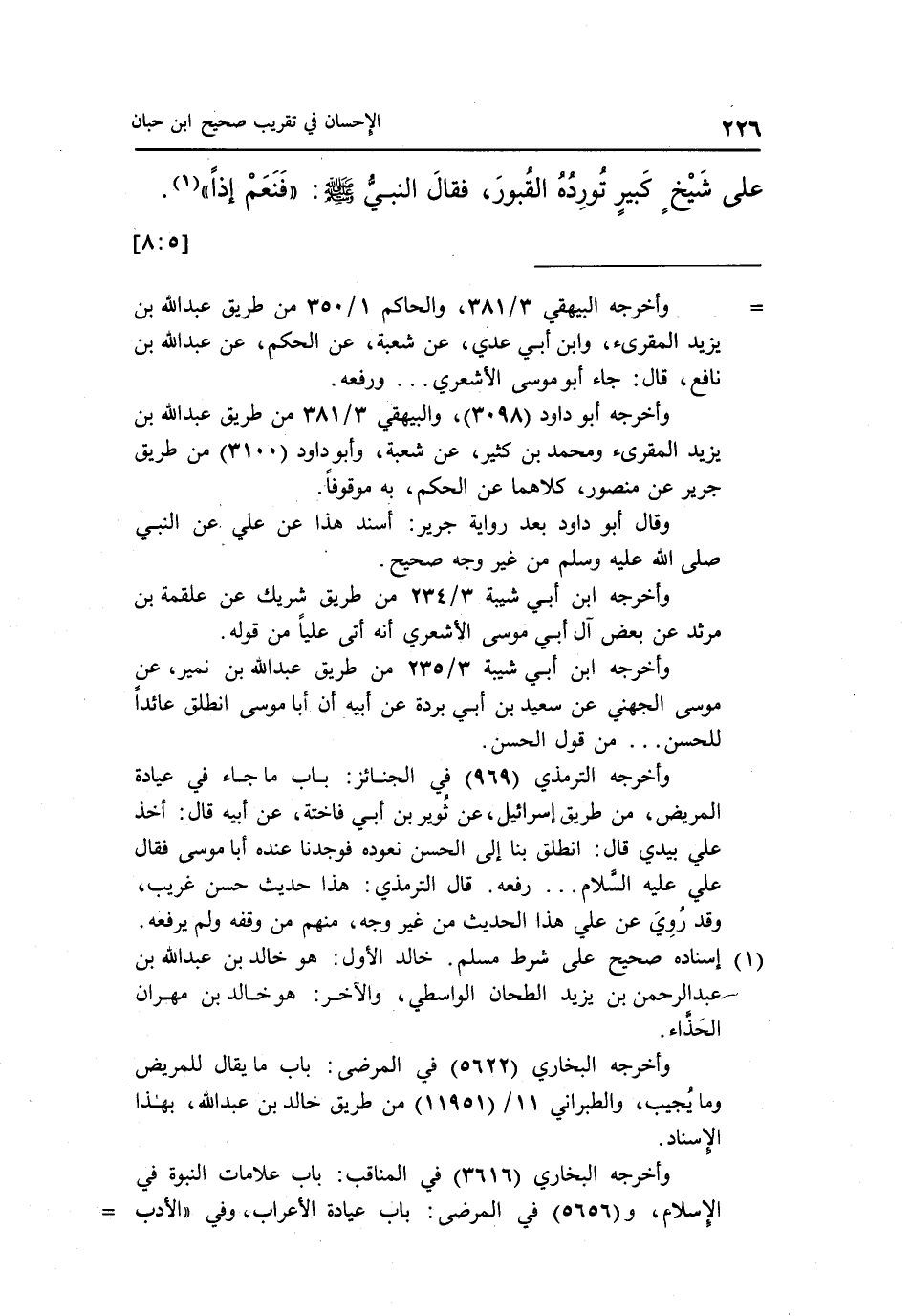 عَنِ بن عَبَّاسٍ أَنَّ رَسُولَ اللَّهِ صَلَّى اللَّهُ عَلَيْهِ وَسَلَّمَ دَخَلَ عَلَى أَعْرَابِيٍّ يَعُودُهُ فَقَالَ: "لَا بَأْسَ طَهُورٌ إِنْ شَاءَ اللَّهُ" فَقَالَ: كَلَّا بَلْ حِمَّى تَفُورُ عَلَى شَيْخٍ كَبِيرٍ تُورِدُهُ الْقُبُورَ فَقَالَ النَّبِيُّ صَلَّى اللَّهُ عَلَيْهِ وَسَلَّمَ: "فنعم إذا" 1. [8:5]