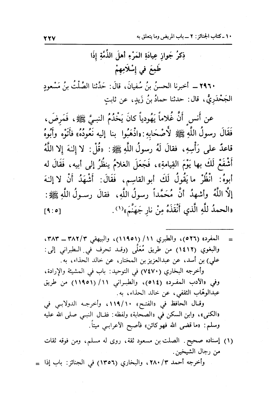 عَنْ أَنَسٍ أَنَّ غُلَامًا يَهُودِيًّا كَانَ يَخْدُمُ النَّبِيَّ صَلَّى اللَّهُ عَلَيْهِ وَسَلَّمَ فَمَرِضَ فَقَالَ رَسُولُ اللَّهِ صَلَّى اللَّهُ عَلَيْهِ وَسَلَّمَ لِأَصْحَابِهِ: "اذْهَبُوا بِنَا إِلَيْهِ نَعُودُهُ" فَأَتَوْهُ وَأَبُوهُ قَاعِدٌ عَلَى رَأْسِهِ فَقَالَ لَهُ رَسُولُ اللَّهِ صَلَّى اللَّهُ عَلَيْهِ وَسَلَّمَ: "قُلْ لَا إِلَهَ إِلَّا اللَّهُ أَشْفَعُ لَكَ بِهَا يَوْمَ الْقِيَامَةِ" فَجَعَلَ الْغُلَامُ يَنْظُرُ إِلَى أَبِيهِ فَقَالَ لَهُ أَبُوهُ: انْظُرْ مَا يَقُولُ لَكَ أَبُو الْقَاسِمِ, فَقَالَ: أَشْهَدُ أَنْ لَا إِلَهَ إِلَّا اللَّهُ وَأَشْهَدُ أَنَّ محمد رَسُولَ اللَّهِ فقَالَ رَسُولُ اللَّهِ صَلَّى اللَّهُ عَلَيْهِ وَسَلَّمَ: "الحمد الله الذي أنقذه من نار جهنم" 1. [9:5]