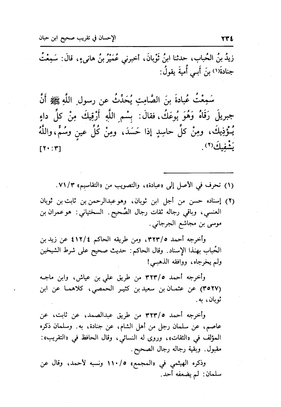 سَمِعْتُ عُبَادَةَ بْنَ الصَّامِتِ يُحَدِّثُ عَنْ رَسُولِ اللَّهِ صَلَّى اللَّهُ عَلَيْهِ وَسَلَّمَ أَنَّ جِبْرِيلَ رَقَاهُ وَهُوَ يُوعَكُ فَقَالَ: بِسْمِ اللَّهِ أَرْقِيكَ مِنْ كُلِّ دَاءٍ يُؤْذِيكَ وَمَنْ كُلِّ حَاسِدٍ إِذَا حَسَدَ وَمِنْ كُلِّ عَيْنٍ وسم والله يشفيك2. [20:1]