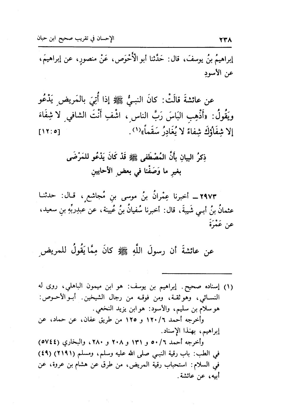 عَنْ عَائِشَةَ قَالَتْ: كَانَ النَّبِيُّ صَلَّى اللَّهُ عَلَيْهِ وَسَلَّمَ إِذَا أُتِيَ بِالْمَرِيضِ يَدْعُو وَيَقُولُ: "أَذْهِبِ الْبَاسَ رَبَّ النَّاسِ اشْفِ أَنْتَ الشَّافِي لَا شِفَاءَ إِلَّا شِفَاؤُكَ شِفَاءً لا يغادر سقما" 1. [12:5]