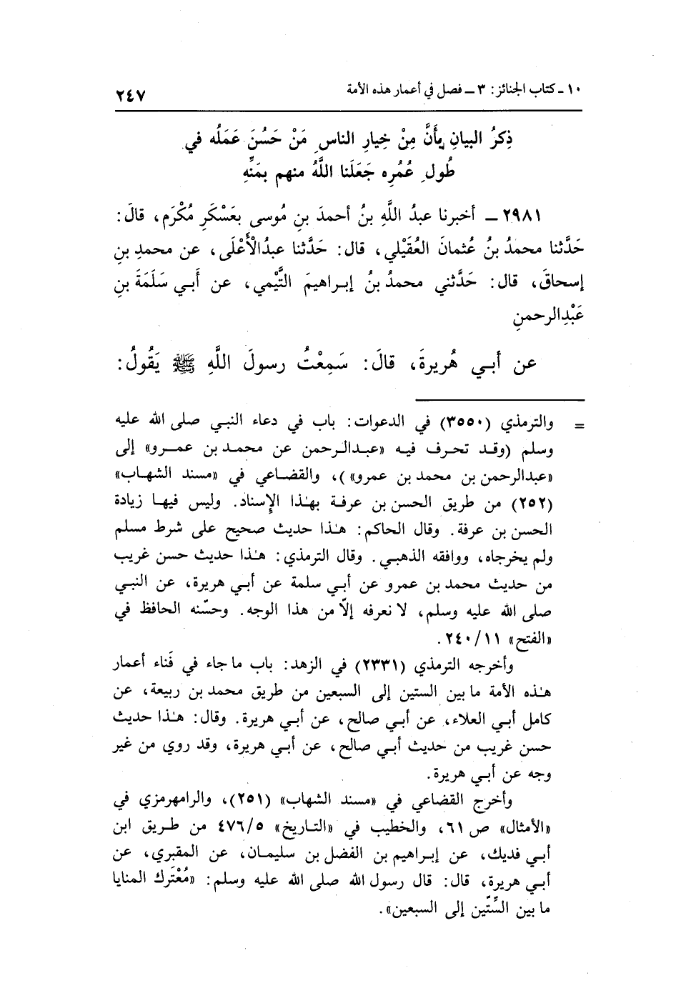 وأخرجه الترمذي "2331" في الزهد: باب ما جاء في فناء أعمار هذه الأمة ما بين الستين إلى السبعين من طريق محمد بن ربيعة، عن كامل أبي العلاء، عن أبي صالح، عن أبي هريرة. وقال: هذا حديث حسن غريب من حديث أبي صالح، عن أبي هريرة، وقد روي من غير وجه عن أبي هريرة.