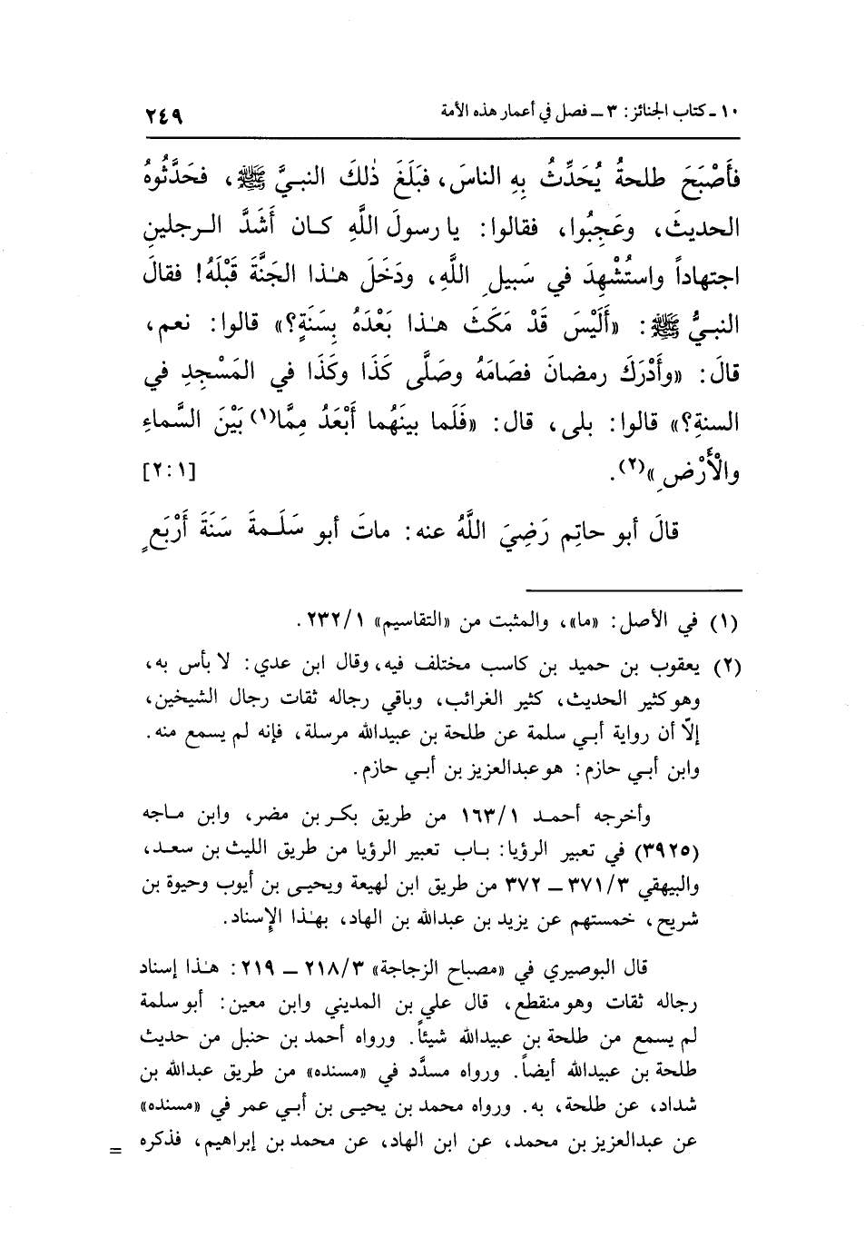 فَأَصْبَحَ طَلْحَةُ يُحَدِّثُ بِهِ النَّاسَ فَبَلَغَ ذَلِكَ النَّبِيَّ صَلَّى اللَّهُ عَلَيْهِ وَسَلَّمَ فَحَدَّثُوهُ الْحَدِيثَ وعجبوا فيه قالوا: يَا رَسُولَ اللَّهِ كَانَ أَشَدَّ الرَّجُلَيْنِ اجْتِهَادًا وَاسْتُشْهِدَ فِي سَبِيلِ اللَّهِ وَدَخَلَ هَذَا الْجَنَّةَ قَبْلَهُ فَقَالَ النَّبِيُّ صَلَّى اللَّهُ عَلَيْهِ وَسَلَّمَ: "أَلَيْسَ قَدْ مَكَثَ هَذَا بَعْدَهُ بِسَنَةٍ" قَالُوا: نَعَمْ قَالَ: "وَأَدْرَكَ رَمَضَانَ فَصَامَهُ وَصَلَّى كَذَا وَكَذَا فِي الْمَسْجِدِ فِي السَنَةِ؟ " قَالُوا: بَلَى قَالَ: "فَلَمَّا بَيْنَهُمَا أَبْعَدُ مِمَّا1 بَيْنَ السَّمَاءِ والأرض" 2. [2:1]