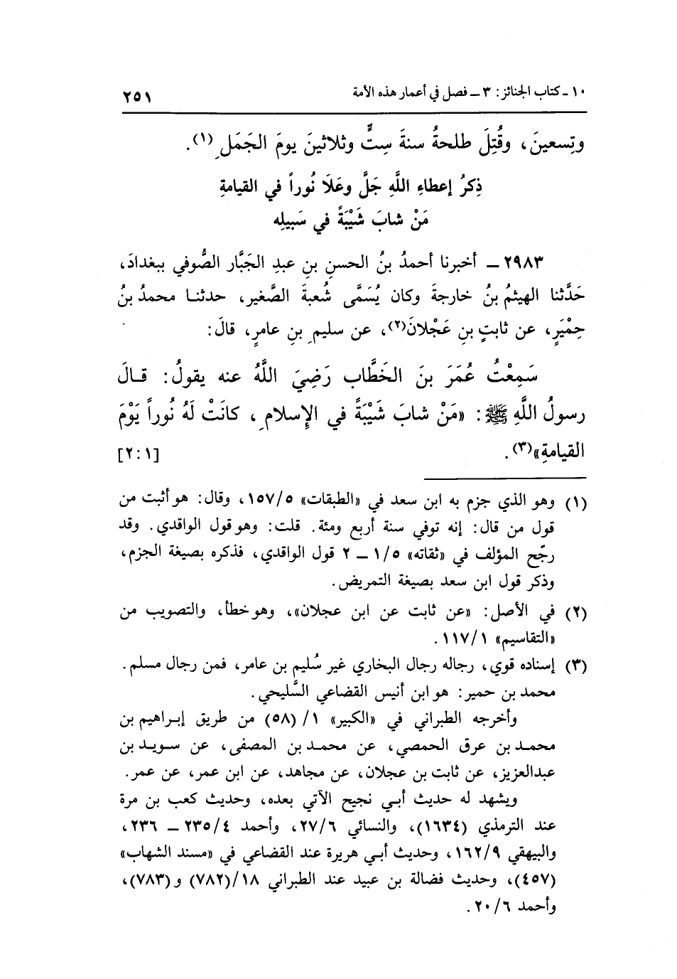 سَمِعْتُ عُمَرَ بْنَ الْخَطَّابِ رَضِيَ اللَّهُ تعالى عَنْهُ يَقُولُ: قَالَ رَسُولُ اللَّهِ صَلَّى اللَّهُ عَلَيْهِ وَسَلَّمَ: "مَنْ شَابَ شَيْبَةً فِي الْإِسْلَامِ كانت له نورا يوم القيامة" 2. [2:1]