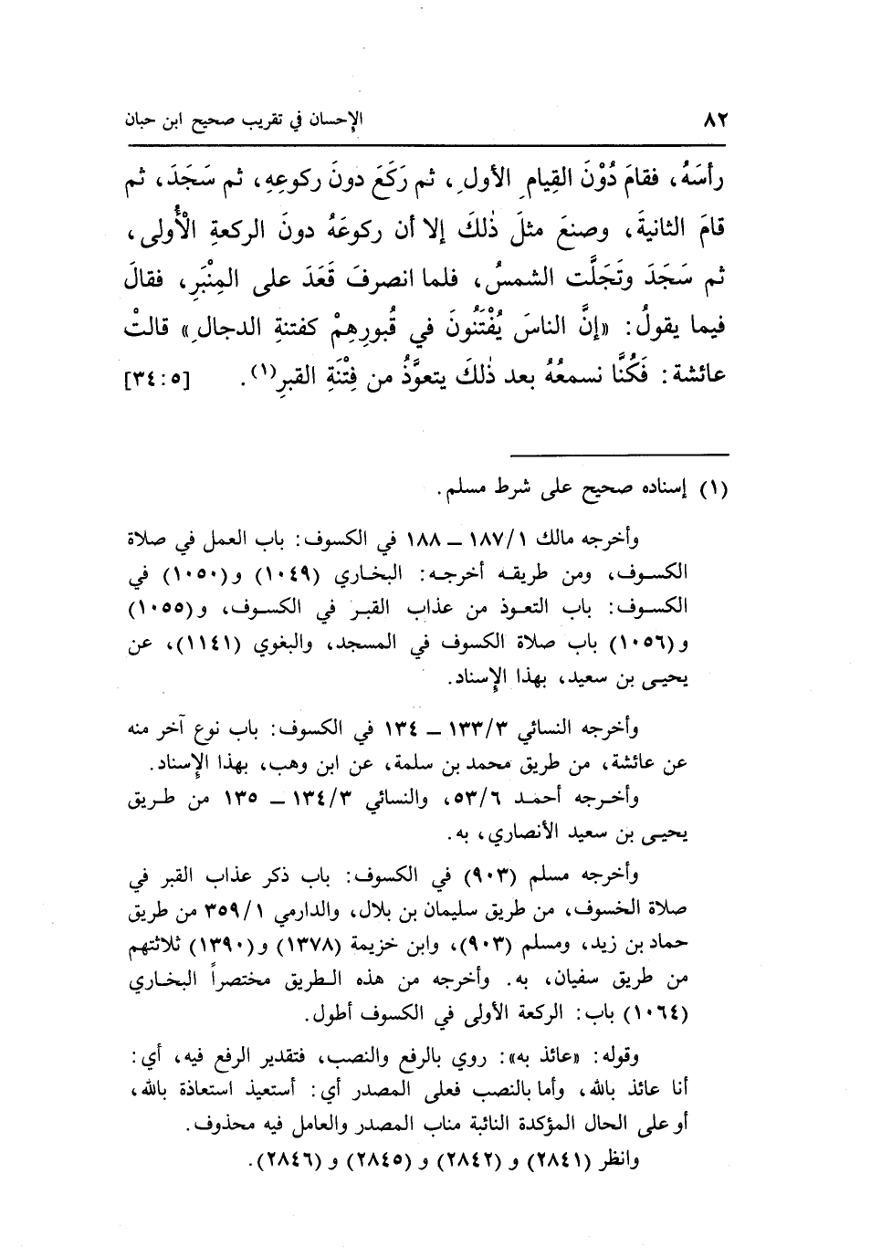 رَأْسَهُ فَقَامَ دُونَ الْقِيَامِ الْأَوْلِ ثُمَّ رَكَعَ دُونَ رُكُوعِهِ ثُمَّ سَجَدَ ثُمَّ قَامَ الثَّانِيَةَ وَصَنَعَ مِثْلَ ذَلِكَ إِلَّا أَنَّ رُكُوعَهُ دُونَ الرَّكْعَةِ الْأُولَى ثُمَّ سَجَدَ وَتَجَلَّتِ الشَّمْسُ فَلَمَّا انْصَرَفَ قَعَدَ عَلَى الْمِنْبَرِ فَقَالَ فِيمَا يَقُولُ: "إِنَّ النَّاسَ يُفْتَنُونَ فِي قُبُورِهِمْ كَفِتْنَةِ الدَّجَّالِ" قَالَتْ عَائِشَةُ:فَكُنَّا نَسْمَعُهُ بَعْدَ ذَلِكَ بِتَعَوُّذٍ من فتنة القبر1. [34:5]