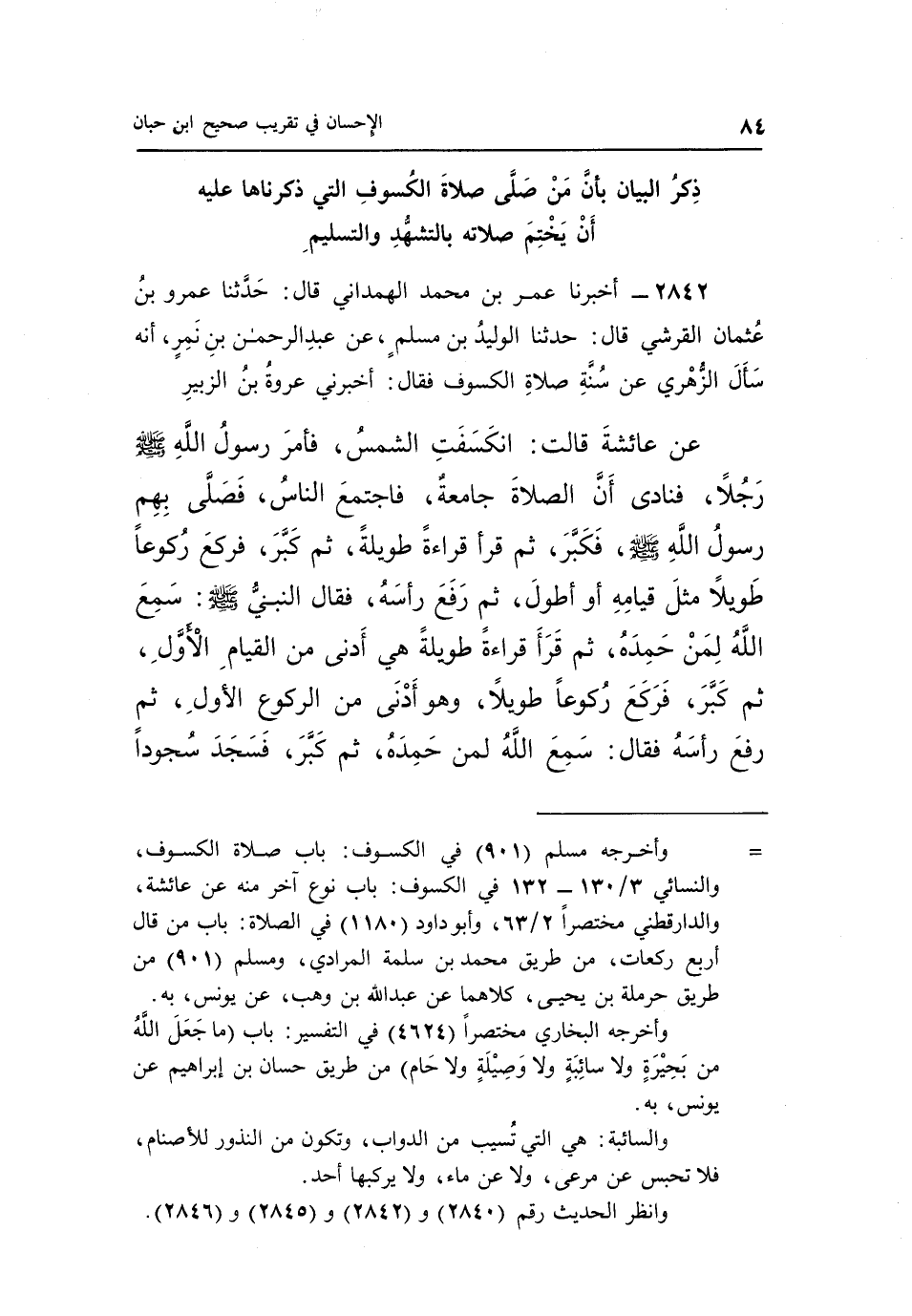 2842 - أَخْبَرَنَا عُمَرُ بْنُ مُحَمَّدٍ الْهَمْدَانِيُّ قَالَ حَدَّثَنَا عَمْرُو بْنُ عُثْمَانَ الْقُرَشِيُّ قَالَ حَدَّثَنَا الْوَلِيدُ بْنُ مُسْلِمٍ عَنْ عَبْدِ الرَّحْمَنِ بْنِ نَمِرٍ أَنَّهُ سَأَلَ الزُّهْرِيَّ عَنْ سُنَّةِ صَلَاةِ الْكُسُوفِ فَقَالَ أَخْبَرَنِي عُرْوَةُ بْنُ الزُّبَيْرِ