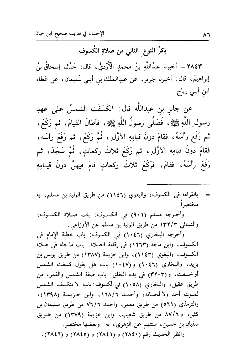 2843 - أَخْبَرَنَا عَبْدُ اللَّهِ بْنُ مُحَمَّدٍ الْأَزْدِيُّ قَالَ: حَدَّثَنَا إِسْحَاقُ بْنُ إِبْرَاهِيمَ قَالَ: أَخْبَرَنَا جَرِيرٌ عَنْ عَبْدُ الْمَلِكِ بْنُ أَبِي سُلَيْمَانَ عَنْ عَطَاءٍ بْنِ أَبِي رَبَاحٍ عَنْ جَابِرِ بْنِ عَبْدِ اللَّهِ قَالَ: انْكَسَفَتِ الشَّمْسُ عَلَى عَهْدِ رَسُولِ اللَّهِ صَلَّى اللَّهُ عَلَيْهِ وَسَلَّمَ فَصَلَّى رَسُولُ اللَّهِ صَلَّى اللَّهُ عَلَيْهِ وَسَلَّمَ فَأَطَالَ الْقِيَامَ ثُمَّ رَكَعَ ثُمَّ رَفَعَ رَأْسَهُ فَقَامَ دُونَ قِيَامِهِ الْأَوْلِ ثُمَّ رَكَعَ ثُمَّ رَفَعَ رَأْسَهُ فَقَامَ دُونَ قِيَامِهِ الْأَوْلِ ثُمَّ رَكَعَ ثَلَاثَ رَكَعَاتٍ ثُمَّ سَجَدَ ثُمَّ رَفَعَ رَأْسَهُ فَقَامَ فَرَكَعَ ثَلَاثَ رَكَعَاتٍ قَامَ فِيهِنَّ دُونَ قِيَامِهِ
