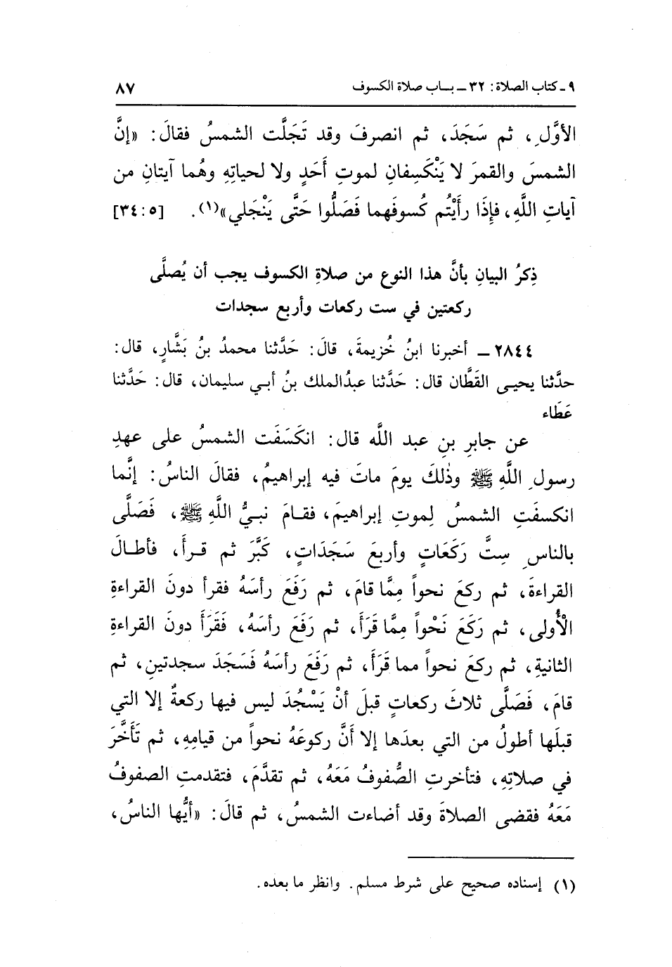 عَنْ جَابِرِ بْنِ عَبْدِ اللَّهِ قَالَ: انْكَسَفَتِ الشَّمْسُ عَلَى عَهْدِ رَسُولِ اللَّهِ صَلَّى اللَّهُ عَلَيْهِ وَسَلَّمَ وَذَلِكَ يَوْمَ مَاتَ فِيهِ إِبْرَاهِيمُ فَقَالَ النَّاسُ: إِنَّمَا انْكَسَفَتِ الشَّمْسُ لِمَوْتِ إِبْرَاهِيمَ فَقَامَ نَبِيُّ اللَّهِ صَلَّى اللَّهُ عَلَيْهِ وَسَلَّمَ فَصَلَّى بِالنَّاسِ سِتَّ رَكَعَاتٍ وَأَرْبَعَ سَجَدَاتٍ كَبَّرَ ثُمَّ قَرَأَ فَأَطَالَ الْقِرَاءَةَ ثُمَّ رَكَعَ نَحْوًا مِمَّا قَامَ ثُمَّ رَفَعَ رَأْسَهُ فَقَرَأَ دُونَ الْقِرَاءَةِ الْأُولَى ثُمَّ رَكَعَ نَحْوًا مِمَّا قَرَأَ ثُمَّ رَفَعَ رَأْسَهُ فَقَرَأَ دُونَ الْقِرَاءَةِ الثَّانِيَةِ ثم ركع نحوا مما قرأ رَفَعَ رَأْسَهُ فَسَجَدَ سَجْدَتَيْنِ ثُمَّ قَامَ فَصَلَّى ثَلَاثَ رَكَعَاتٍ قَبْلَ أَنْ يَسْجُدَ لَيْسَ فِيهَا رَكْعَةٌ إِلَّا الَّتِي قَبْلَهَا أَطْوَلُ مِنَ الَّتِي بَعْدَهَا إِلَّا أَنَّ رُكُوعَهُ نَحْوًا مِنْ قِيَامِهِ ثُمَّ تَأَخَّرَ فِي صَلَاتِهِ فَتَأَخَّرَتِ الصُّفُوفُ مَعَهُ ثُمَّ تَقَدَّمَ فَتَقَدَّمْتُ الصُّفُوفُ مَعَهُ فَقَضَى الصَّلَاةَ وَقَدْ أَضَاءَتِ الشَّمْسُ ثُمَّ قَالَ: "أَيُّهَا النَّاسُ