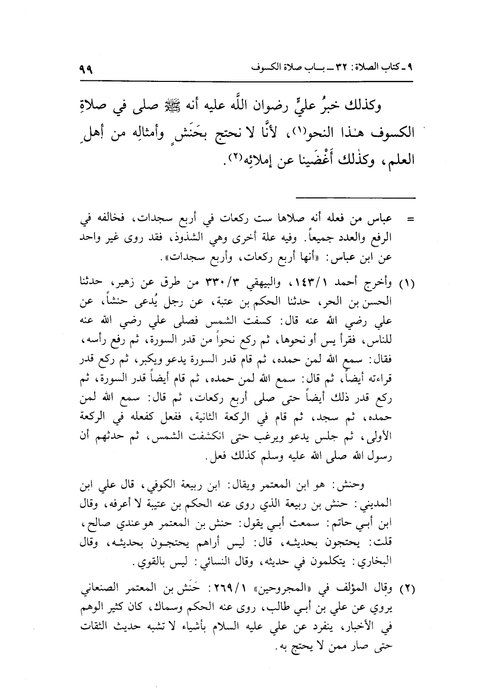 وَكَذَلِكَ خَبَرُ عَلِيٍّ رِضْوَانُ اللَّهُ عَلَيْهِ أَنَّهُ صَلَّى اللَّهُ عَلَيْهِ وَسَلَّمَ صَلَّى فِي صَلَاةِ الْكُسُوفِ هَذَا النَّحْوَ1 لَأَنَا لَا نَحْتَجَّ بِحَنَشٍ وَأَمْثَالِهِ مِنْ أَهْلِ الْعِلْمِ وَكَذَلِكَ أَغْضَيْنَا عَنْ إملائه2.