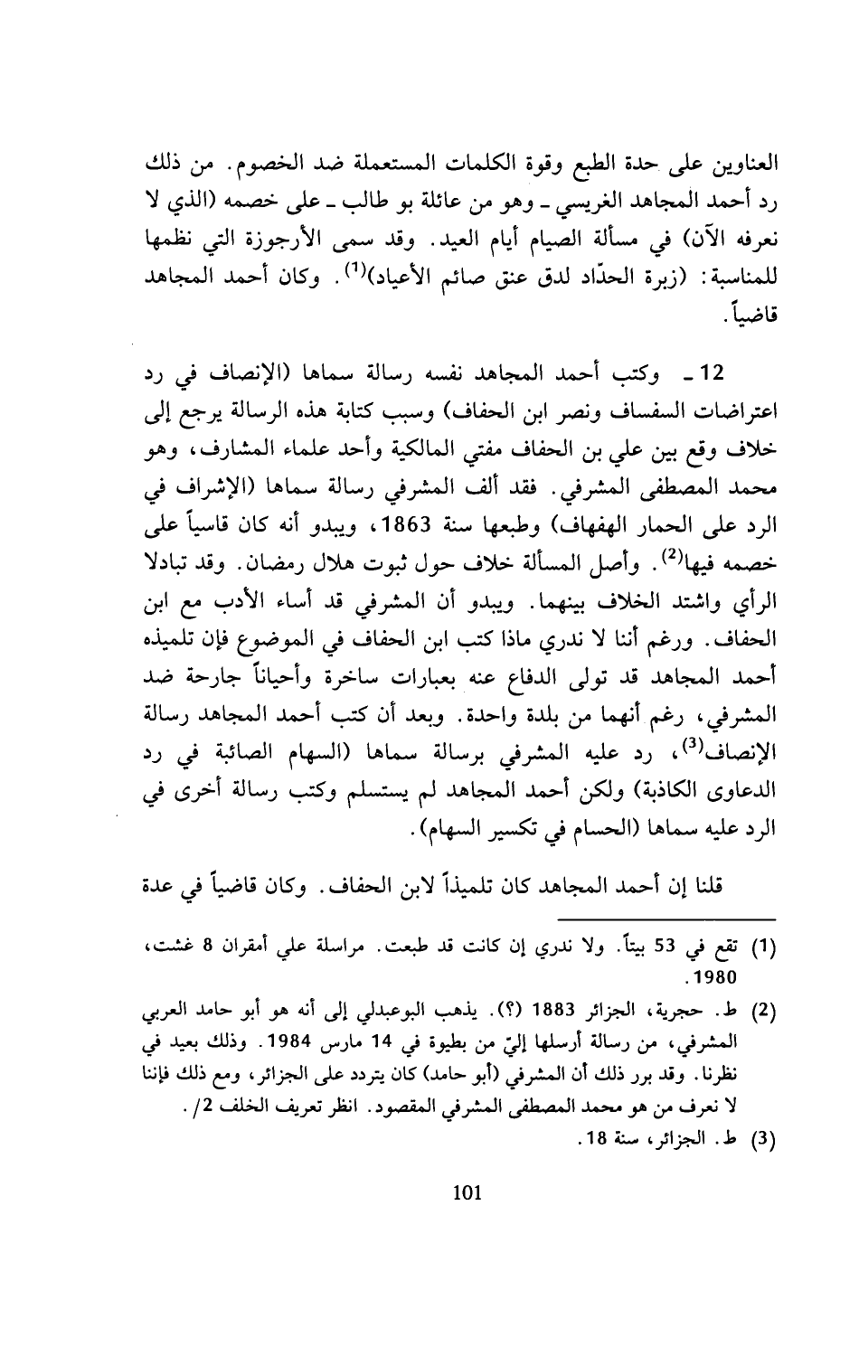 12 - وكتب أحمد المجاهد نفسه رسالة سماها (الإنصاف في رد اعتراضات السفساف ونصر ابن الحفاف) وسبب كتابة هذه الرسالة يرجع إلى خلاف وقع بين علي بن الحفاف مفتي المالكية وأحد علماء المشارف، وهو محمد المصطفى المشرفي. فقد ألف المشرفي رسالة سماها (الإشراف في الرد على الحمار الهفهاف) وطبعها سنة 1863، ويبدو أنه كان قاسيا على خصمه فيها (¬2). وأصل المسألة خلاف حول ثبوت هلال رمضان. وقد تبادلا الرأي واشتد الخلاف بينهما. ويدو أن المشرفي قد أساء الأدب مع ابن الحفاف. ورغم أننا لا ندري ماذا كتب ابن الحفاف في الموضوع فإن تلميذه أحمد المجاهد قد تولى الدفاع عنه بعبارات ساخرة وأحيانا جارحة ضد المشرفي، رغم أنهما من بلدة واحدة. وبعد أن كتب أحمد المجاهد رسالة الإنصاف (¬3)، رد عليه المشرفي برسالة سماها (السهام الصائبة في رد الدعاوى الكاذبة) ولكن أحمد المجاهد لم يستسلم وكتب رسالة أخرى في الرد عليه سماها (الحسام في تكسير السهام).