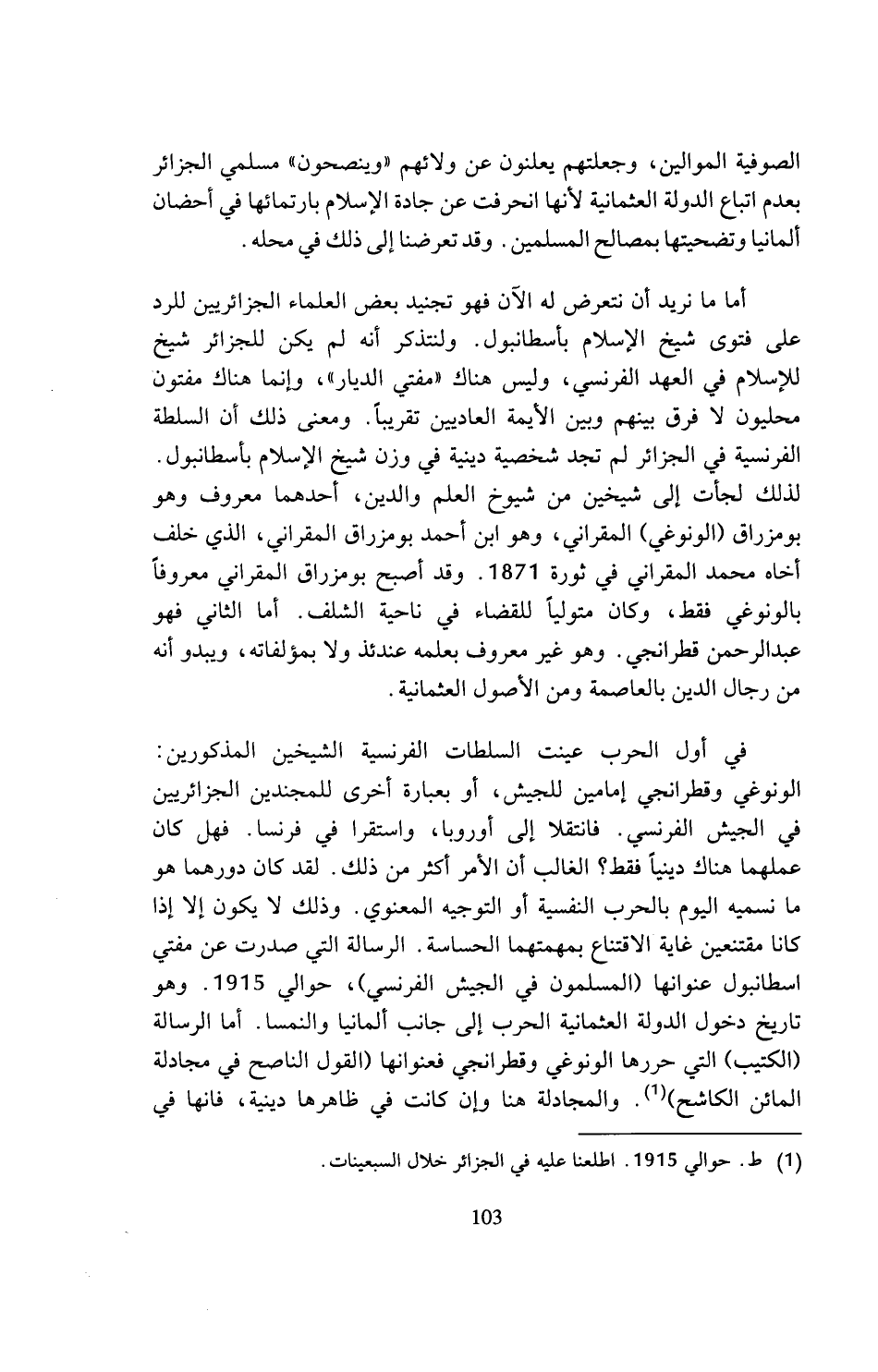 أما ما نريد أن نتعرض له الآن فهو تجنيد بعض العلماء الجزائريين للرد على فتوى شيخ الإسلام بأسطانبول. ولنتذكر أنه لم يكن للجزائر شيخ للإسلام في العهد الفرنسي، وليس هناك (مفتي الديار)، وإنما هناك مفتون محليون لا فرق بينهم وبين الأيمة العاديين تقريبا. ومعنى ذلك أن السلطة الفرنسية في الجزائر لم تجد شخصية دينية في وزن شيخ الإسلام بأسطانبول. لذلك لجأت إلى شيخين من شيوخ العلم والدين، أحدهما معروف وهو بومزراق (الونوغي) المقراني، وهو ابن أحمد بومزراق المقراني، الذي خلف أخاه محمد المقراني في ثورة 1871. وقد أصبح بومزراق المقراني معروفا بالونوغي فقط، وكان متوليا للقضاء في ناحية الشلف. أما الثاني فهو عبد الرحمن قطرانجي. وهو غير معروف بعلمه عندئذ ولا بمؤلفاته، ويبدو أنه من رجال الدين بالعاصمة ومن الأصول العثمانية.