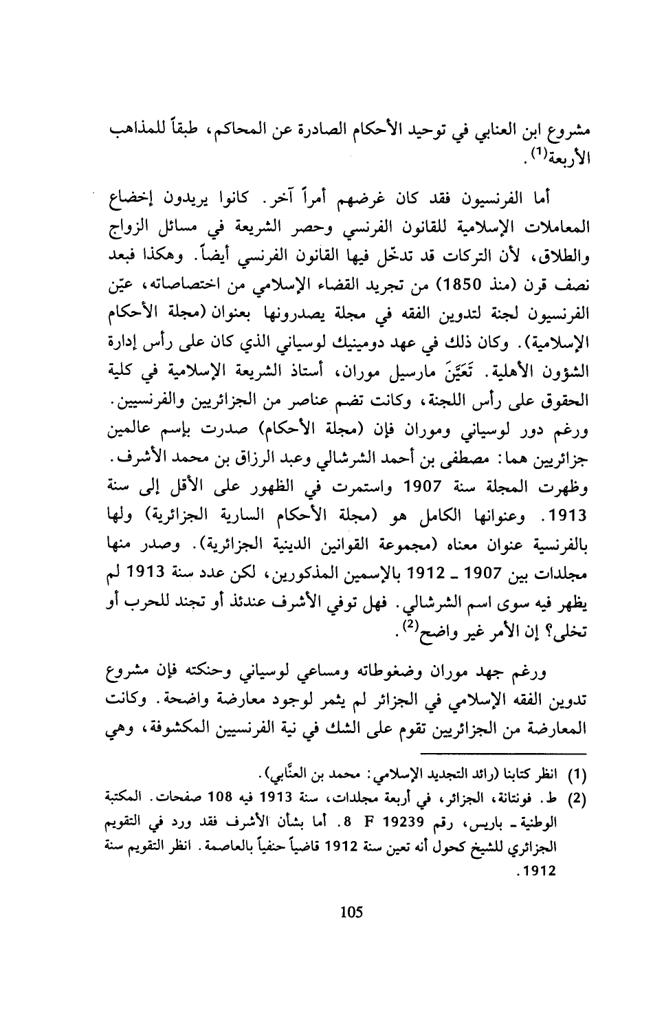 أما الفرنسيون فقد كان غرضهم أمرا آخر. كانوا يريدون إخضاع المعاملات الإسلامية للقانون الفرنسي وحصر الشريعة في مسائل الزواج والطلاق، لأن التركات قد تدخل فيها القانون الفرنسي أيضا. وهكذا فبعد نصف قرن (منذ 1850) من تجريد القضاء الإسلامي من اختصاصاته، عين الفرنسيون لجنة لتدوين الفقه في مجلة يصدرونها بعنوان (مجلة الأحكام الإسلامية). وكان ذلك في عهد دومينيك لوسياني الذي كان على رأس إدارة الشؤون الأهلية. تعين مارسيل موران، أستاذ الشريعة الإسلامية في كلية الحقوق على رأس اللجنة، وكانت تضم عناصر من الجزائريين والفرنسيين. ورغم دور لوسياني وموران فإن (مجلة الأحكام) صدرت بإسم عالمين جزائريين هما: مصطفى بن أحمد الشرشالي وعبد الرزاق بن محمد الأشرف. وظهرت المجلة سنة 1907 واستمرت في الظهور على الأقل إلى سنة 1913. وعنوانها الكامل هو (مجلة الأحكام السارية الجزائرية) ولها بالفرنسية عنوان معناه (مجموعة القوانين الدينية الجزائرية). وصدر منها مجلدات بين 1907 - 1912 بالإسمين المذكورين، لكن عدد سنة 1913 لم يظهر فيه سوى اسم الشرشالي. فهل توفي الأشرف عندئذ أو تجند للحرب أو تخلى؟ إن الأمر غير واضح (¬2).