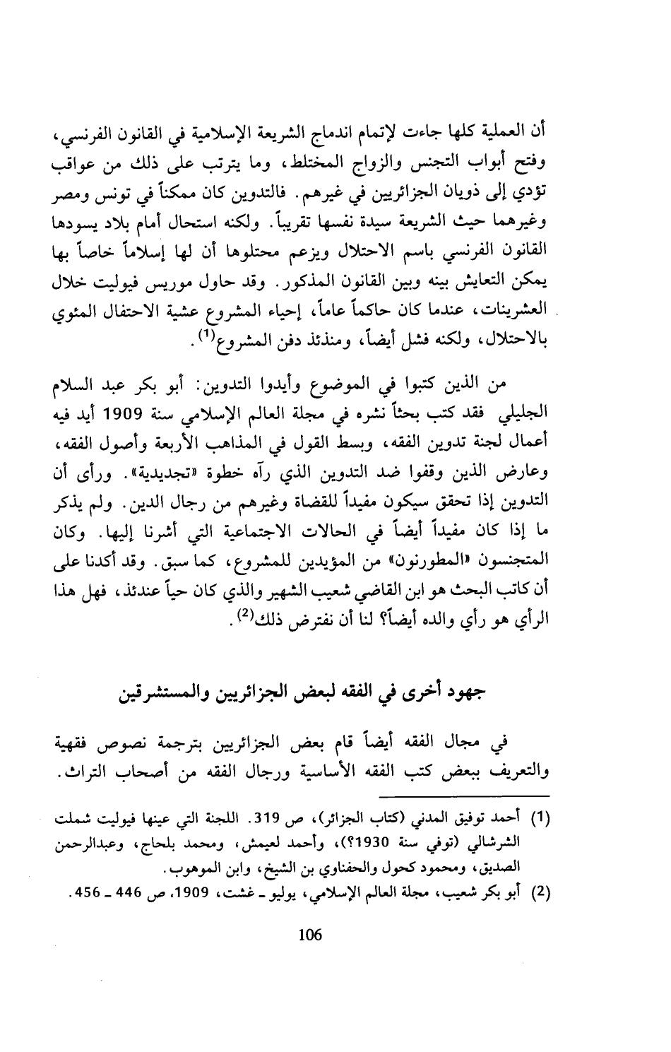 أن العملية كلها جاءت لإتمام اندماج الشريعة الإسلامية في القانون الفرنسي، وفتح أبواب التجنس والزواج المختلط، وما يترتب على ذلك من عواقب تؤدي إلى ذوبان الجزائريين في غيرهم. فالتدوين كان ممكنا في تونس ومصر وغيرهما حيث الشريعة سيدة نفسها تقريبا. ولكنه استحال أمام بلاد يسودها القانون الفرنسي باسم الاحتلال ويزعم محتلوها أن لها إسلاما خاصا بها يمكن التعايش بينه وبين القانون المذكور. وقد حاول موريس فيوليت خلال العشرينات، عندما كان حاكما عاما، إحياء المشروع عشية الاحتفال المئوي بالاحتلال، ولكنه فشل أيضا، ومنذئذ دفن المشروع (¬1).