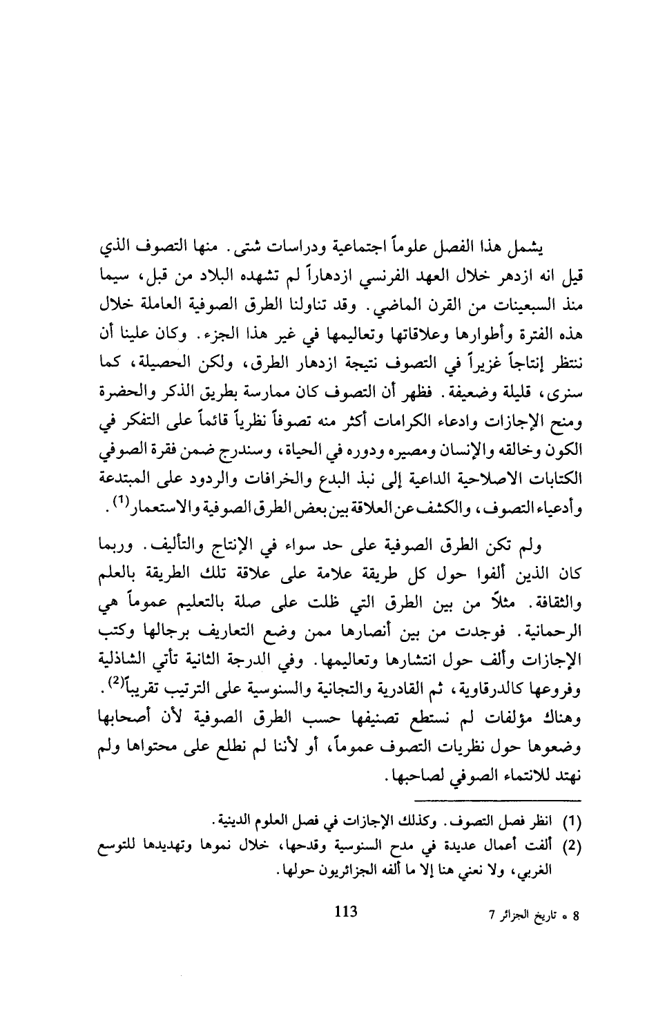 يشمل هذا الفصل علوما اجتماعية ودراسات شتى. منها التصوف الذي قيل انه ازدهر خلال العهد الفرنسي ازدهارا لم تشهده البلاد من قبل، سيما منذ السبعينات من القرن الماضي. وقد تناولنا الطرق الصوفية العاملة خلال هذه الفترة وأطوارها وعلاقاتها وتعاليمها في غير هذا الجزء. وكان علينا أن ننتظر إنتاجا غزيرا في التصوف نتيجة ازدهار الطرق، ولكن الحصيلة، كما سنرى، قليلة وضعيفة. فظهر أن التصوف كان ممارسة بطريق الذكر والحضرة ومنح الإجازات وادعاء الكرامات أكثر منه تصوفا نظريا قائما على التفكر في الكون وخالقه والإنسان ومصيره ودوره في الحياة، وسندرج ضمن فقرة الصوفي الكتابات الاصلاحية الداعية إلى نبذ البدع والخرافات والردود على المبتدعة وأدعياء التصوف، والكشف عن العلاقة بين بعض الطرق الصوفية والاستعمار (¬1).