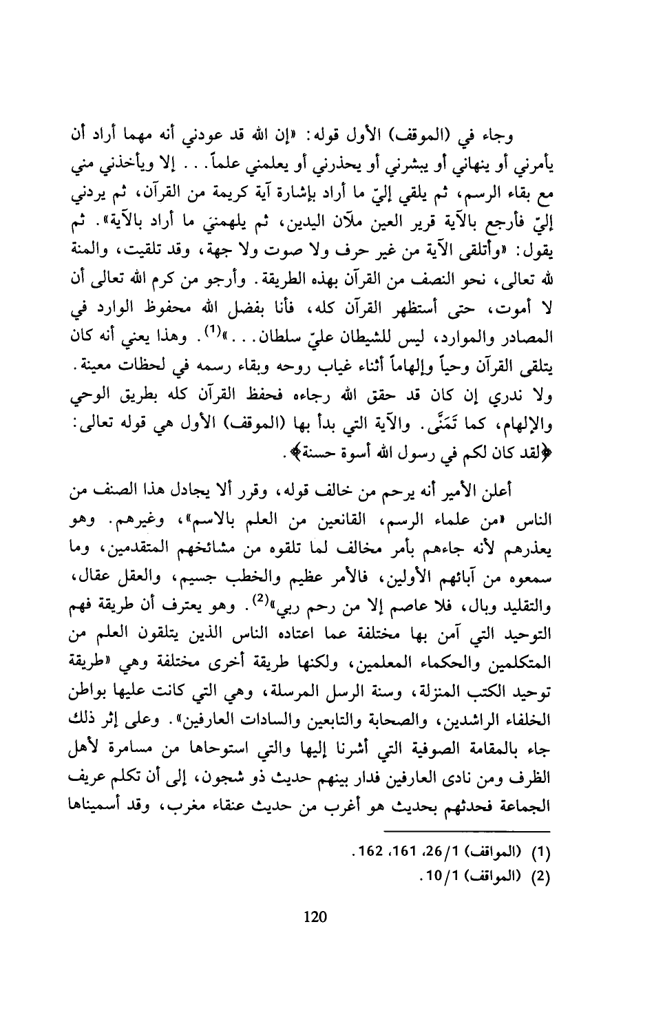 وجاء في (الموقف) الأول قوله: (إن الله قد عودني أنه مهما أراد أن يأمرني أو ينهاني أو يبشرني أو يحذرني أو يعلمني علما ... إلا ويأخذني مني مع بقاء الرسم، ثم يلقي إلي ما أراد بإشارة آية كريمة من القرآن، ثم يردني إلي فأرجع بالآية قرير العين ملآن اليدين، ثم يلهمني ما أراد بالآية). ثم يقول: (وأتلقى الآية من غير حرف ولا صوت ولا جهة، وقد تلقيت، والمنة لله تعالى، نحو النصف من القرآن بهذه الطريقة. وأرجو من كرم الله تعالى أن لا أموت، حتى أستظهر القرآن كله، فأنا بفضل الله محفوظ الوارد في المصادر والموارد، ليس للشيطان علي سلطان ...) (¬1). وهذا يعني أنه كان يتلقى القرآن وحيا وإلهاما أثناء غياب روحه وبقاء رسمه في لحظات معينة. ولا ندري إن كان قد حقق الله رجاءه فحفظ القرآن كله بطريق الوحي والإلهام، كما تمنى. والآن التي بدأ بها (الموقف) الأول هي قوله تعالى: {لقد كان لكم في رسول الله أسوة حسنة}.
