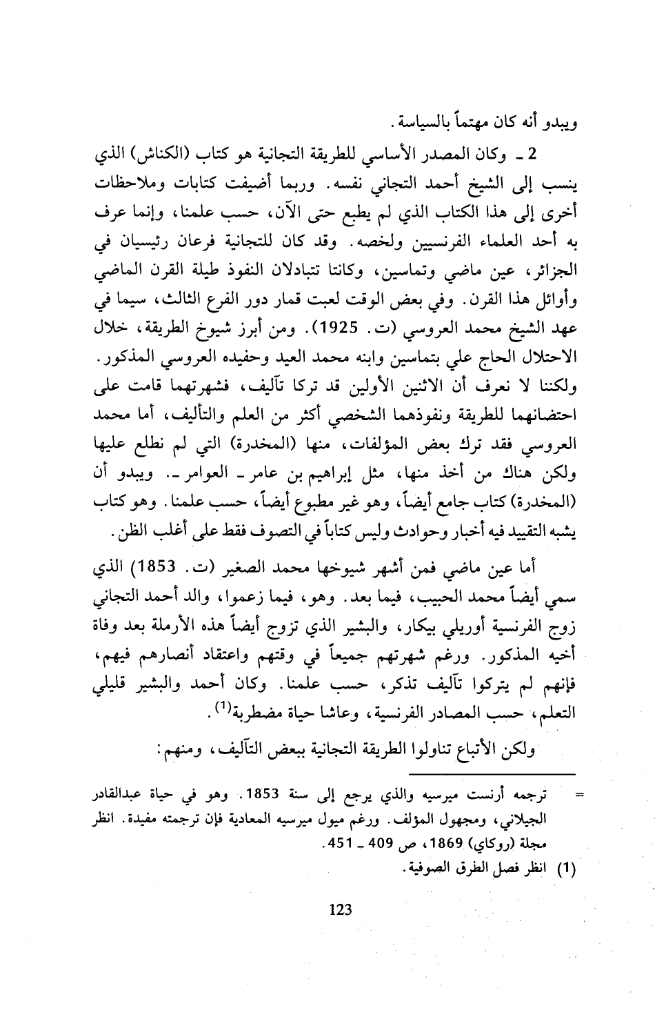 2 - وكان المصدر الأساسي للطريقة التجانية هو كتاب (الكناش) الذي ينسب إلى الشيخ أحمد التجاني نفسه. وربما أضيفت كتابات وملاحظات أخرى إلى هذا الكتاب الذي لم يطبع حتى الآن، حسب علمنا، وإنما عرف به أحد العلماء الفرنسيين ولخصه. وقد كان للتجانية فرعان رئيسيان في الجزائر، عين ماضي وتماسين، وكانتا تتبادلان النفوذ طيلة القرن الماضي وأوائل هذا القرن. وفي بعض الوقت لعبت قمار دور الفرع الثالث، سيما في عهد الشيخ محمد العروسي (ت. 1925). ومن أبرز شيوخ الطريقة، خلال الاحتلال الحاج علي بتماسين وابنه محمد العيد وحفيده العروسي المذكور. ولكننا لا نعرف أن الاثنين الأولين قد تركا تآليف، فشهرتهما قامت على احتضانهما للطريقة ونفوذهما الشخصي أكثر من العلم والتأليف، أما محمد العروسي فقد ترك بعض المؤلفات، منها (المخدرة) التي لم نطلع عليها ولكن هناك من أخذ منها، مثل إبراهيم بن عامر - العوامر -. ويبدو أن (المخدرة) كتاب جامع أيضا، وهو غير مطبوع أيضا، حسب علمنا. وهو كتاب يشبه التقييد فيه أخبار وحوادث وليس كتابا في التصوف فقط على أغلب الظن.