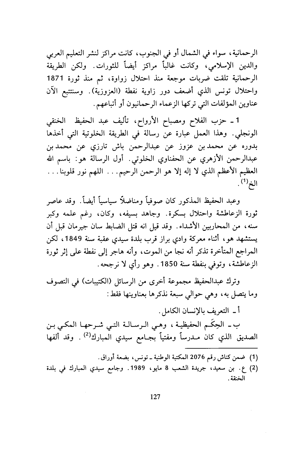 (¬2) ع. بن سعيد، جريدة الشعب 8 مايو، 1989. وجامع سيدي المبارك في بلدة الخنقة.